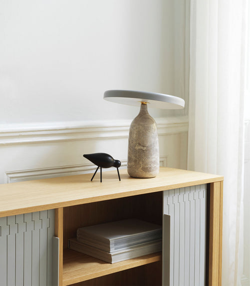 Reverse Table Lamp is a new lighting solution that underpins the ever-present beauty of natural materials. Danish designer Aleksandar Lazic looked to Italian marble tables from the 1970s when creating the Reverse Lamp. Inspired by the play on structure created by geometric constraints, the conical travertine base and curved, bronzed aluminium shade define the lamp’s perfectly balanced expression.