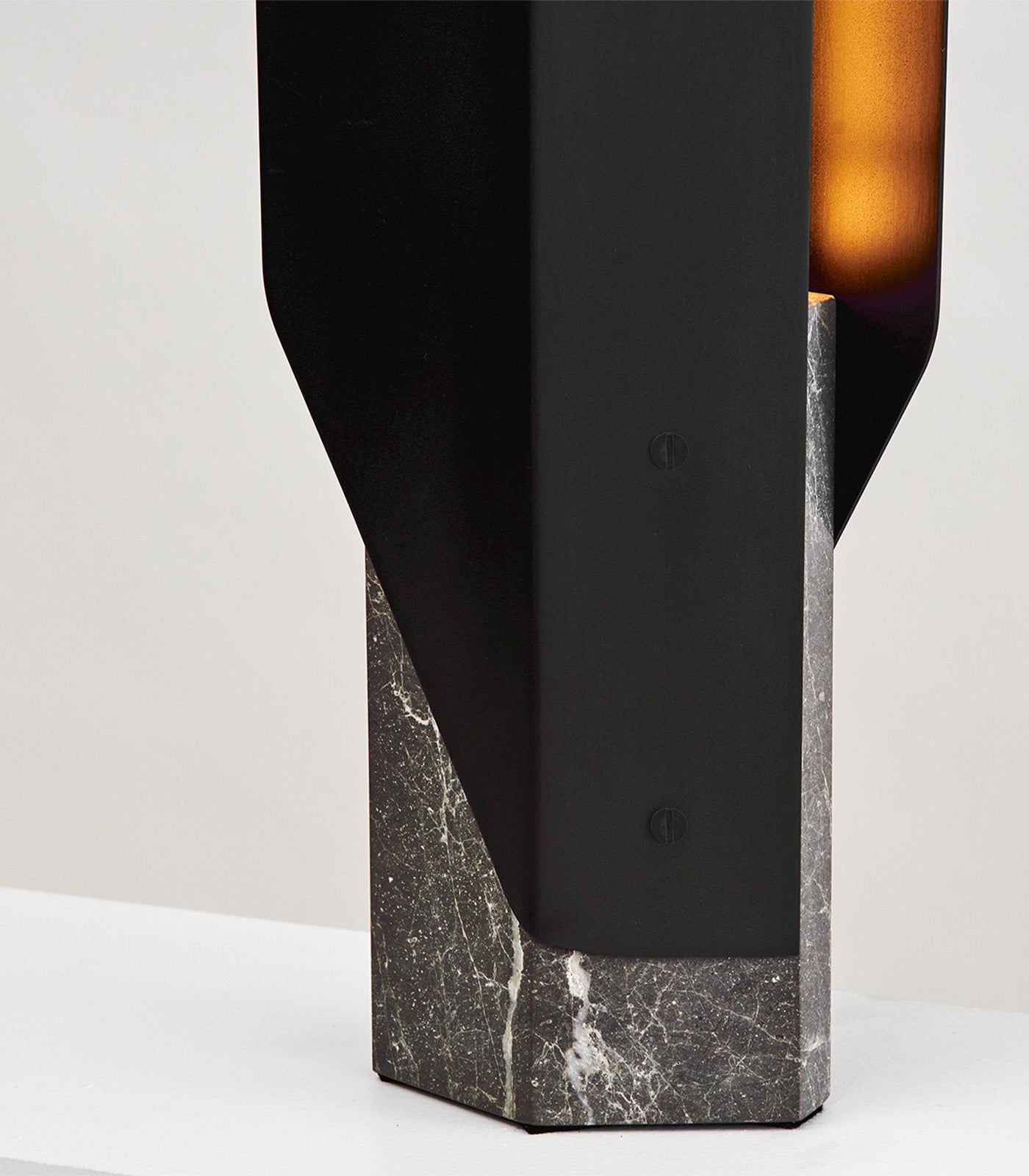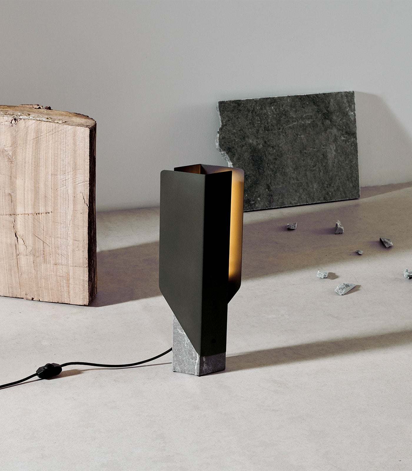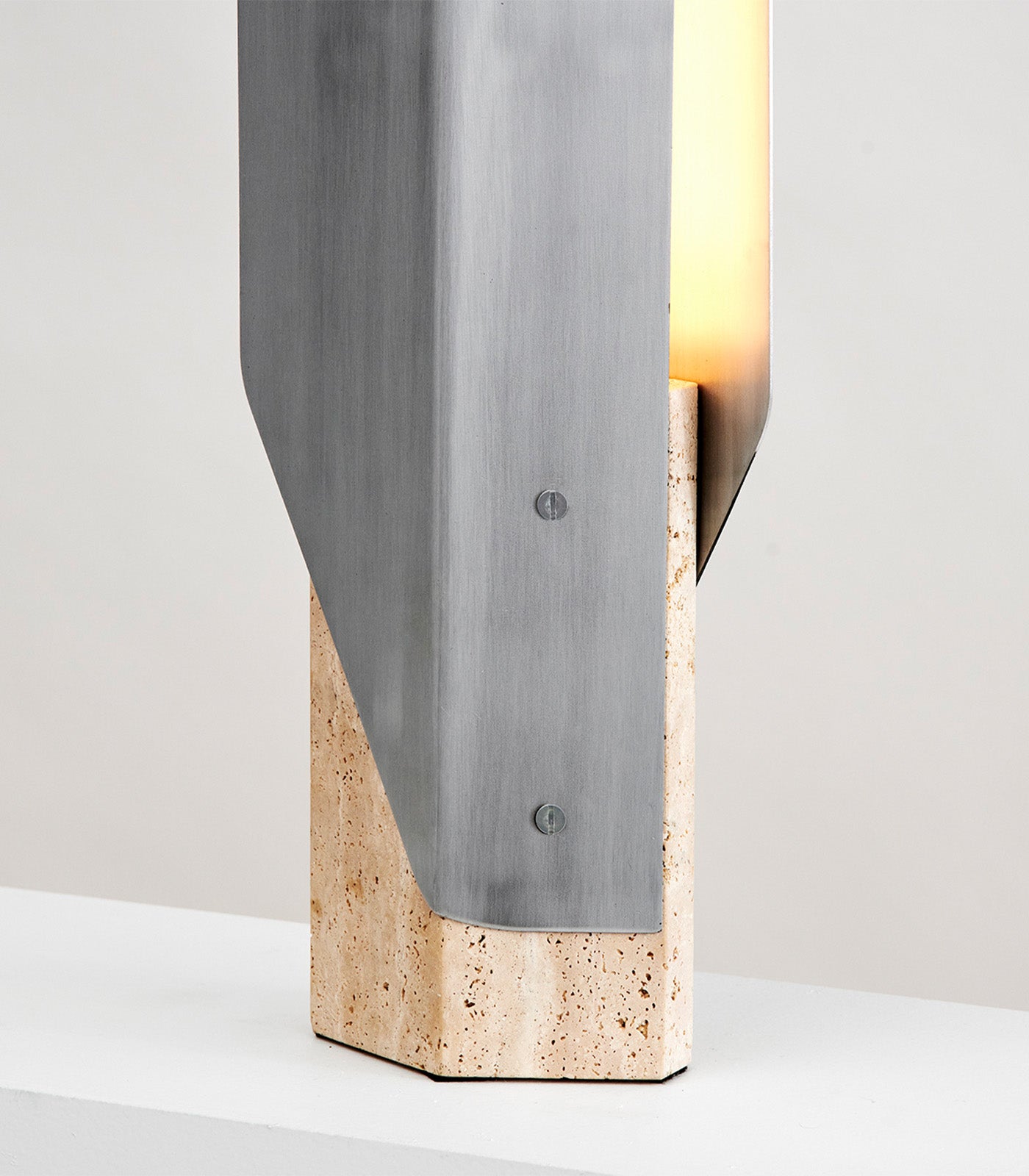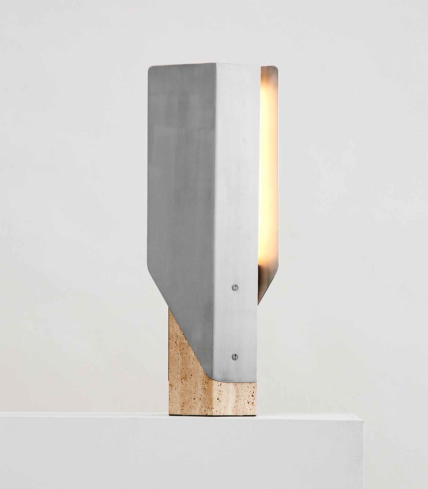 Two editions of the Fold Table Lamp are available. The first matches a solid block of grey marble with an anodised ‘Deep Sea’ aluminium finish. The second features a base of raw travertine and a brushed aluminium finish.
