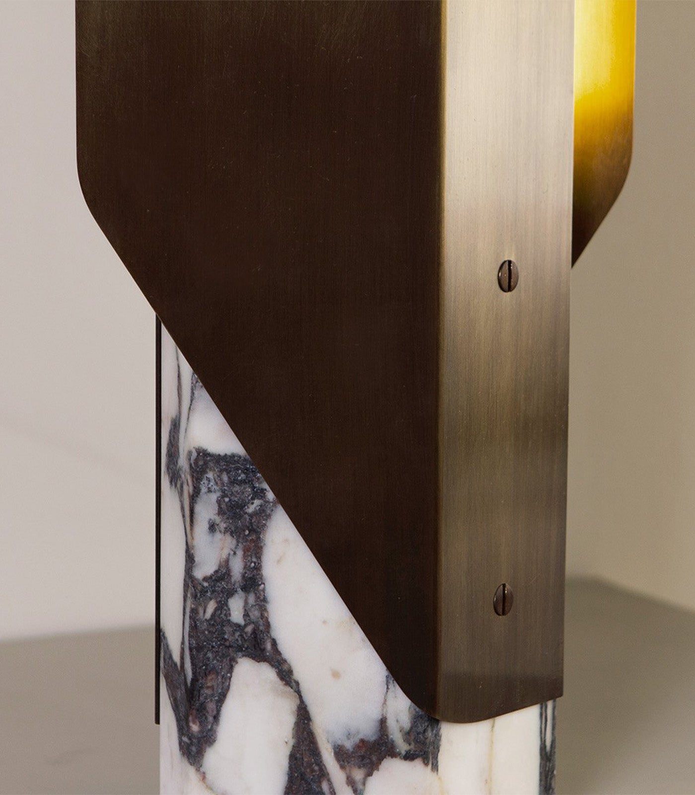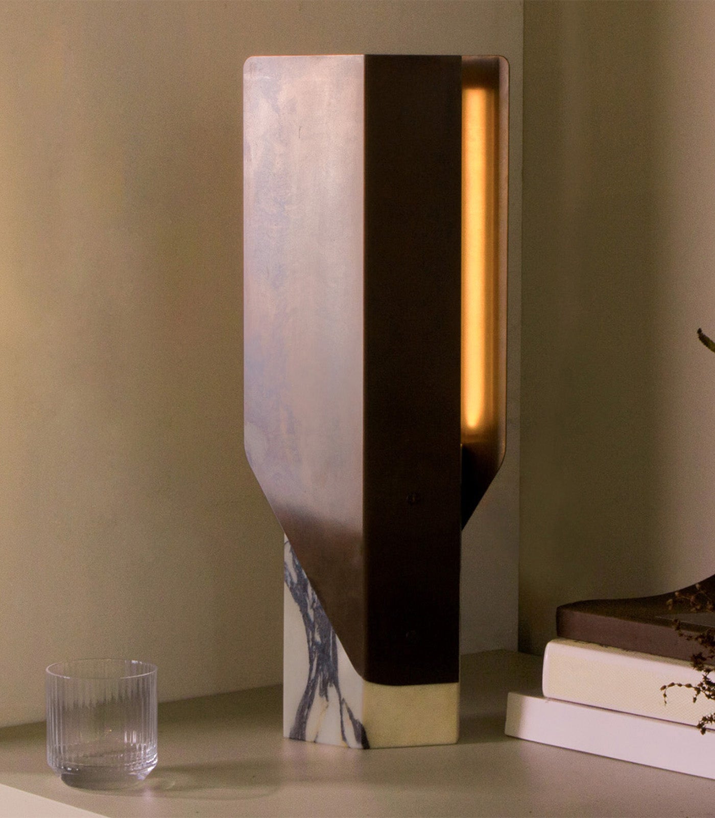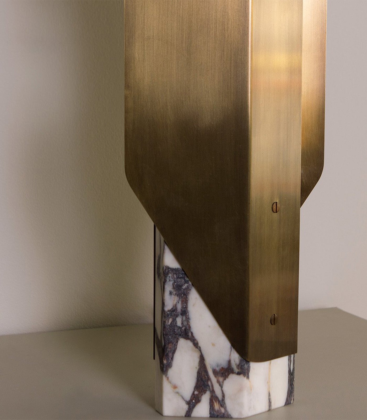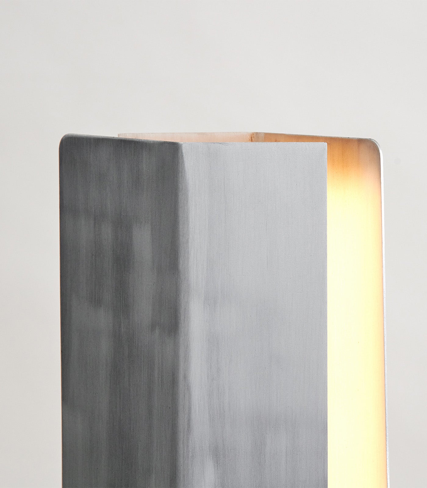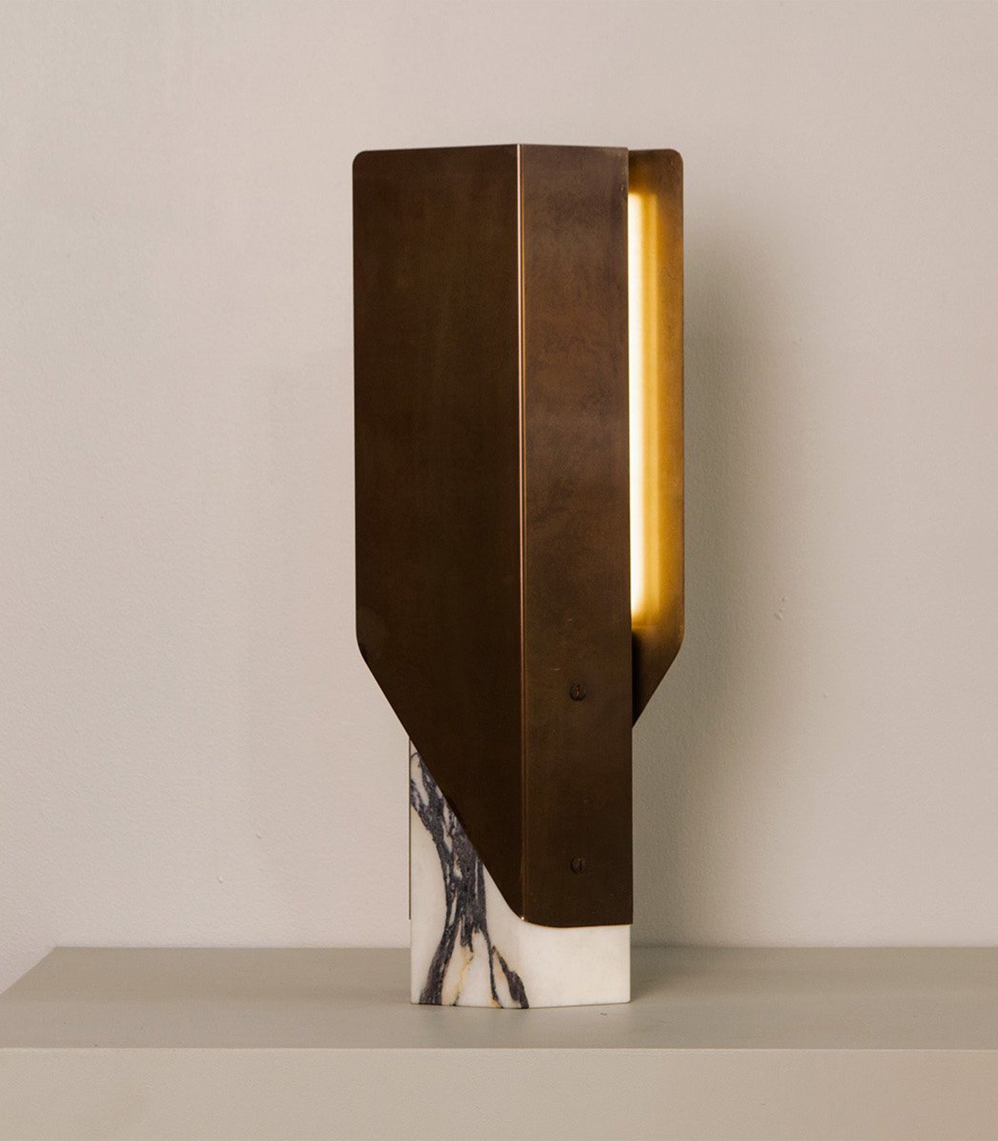 Two editions of the Fold Table Lamp are available. The first matches a solid block of grey marble with an anodised ‘Deep Sea’ aluminium finish. The second features a base of raw travertine and a brushed aluminium finish.