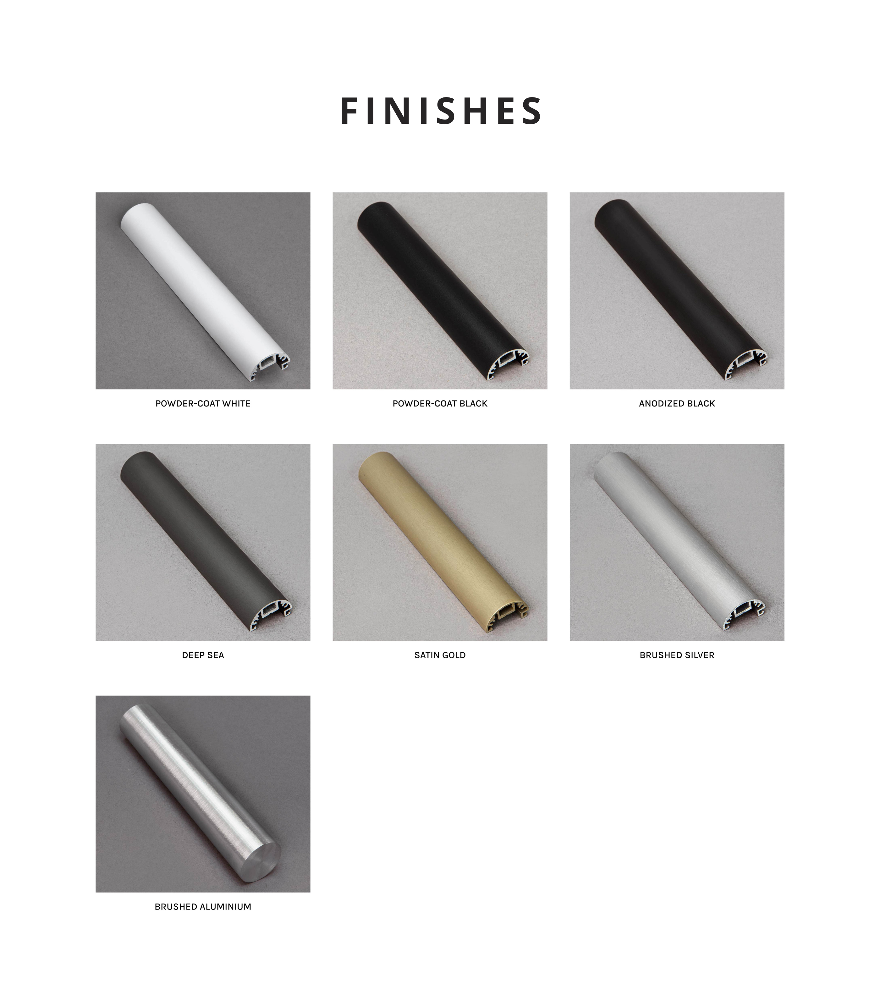 | Finish | Powder-coat White, Powder-coat Black, Anodized Black, Deep Sea, Satin Gold, Brushed Silver or Brushed Aluminium |