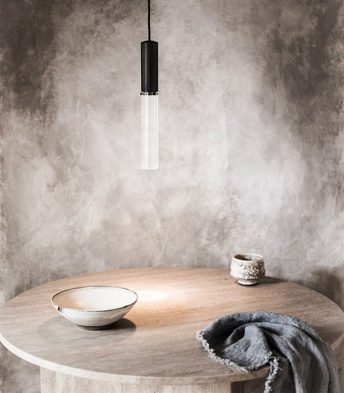 The Lilli Pendant Light, a cylindrical fluted glass shade with an aluminium or brass structure. The Lilli embodies the sleek, streamlined and timeless nature of Italian craftsmanship.