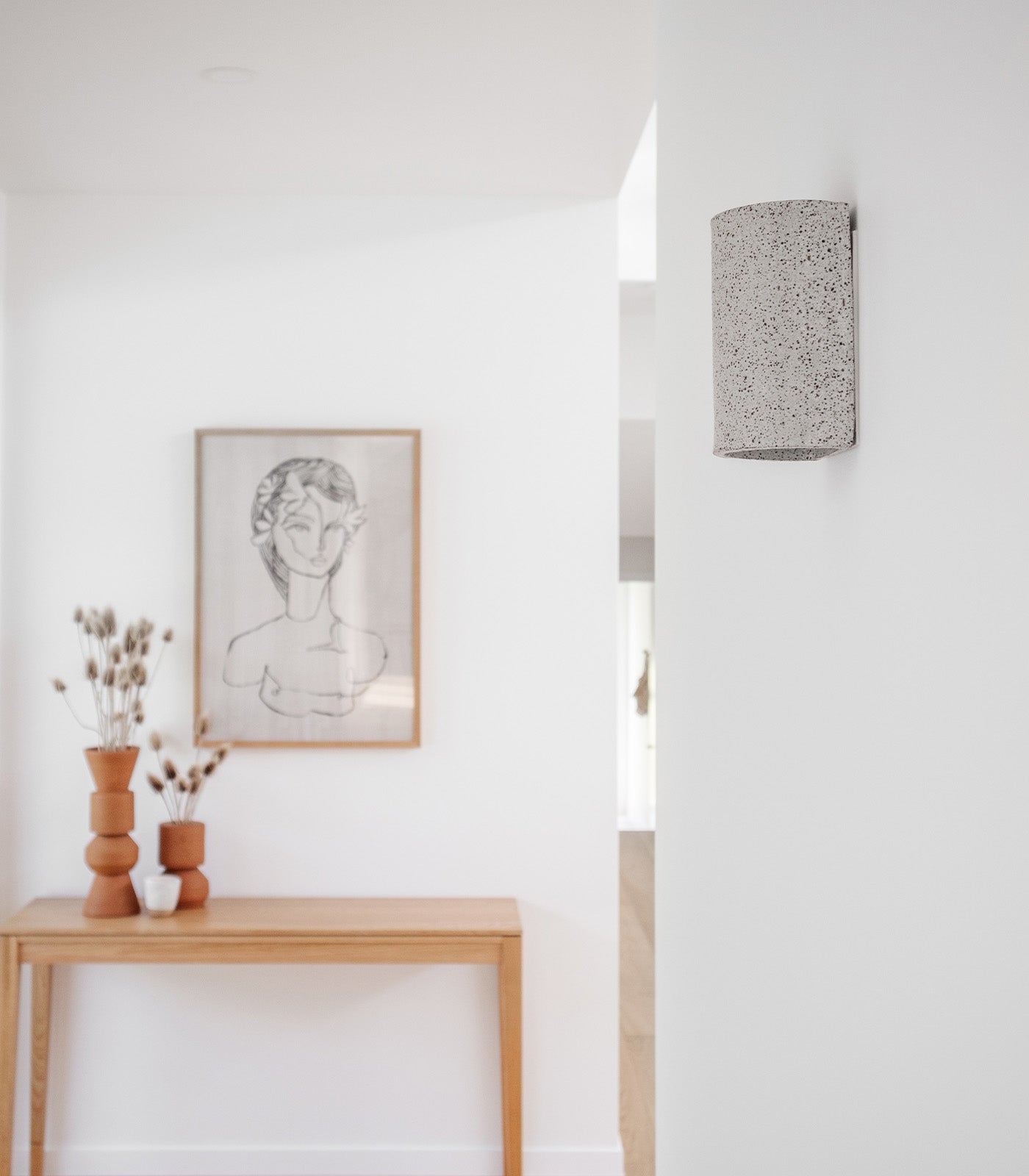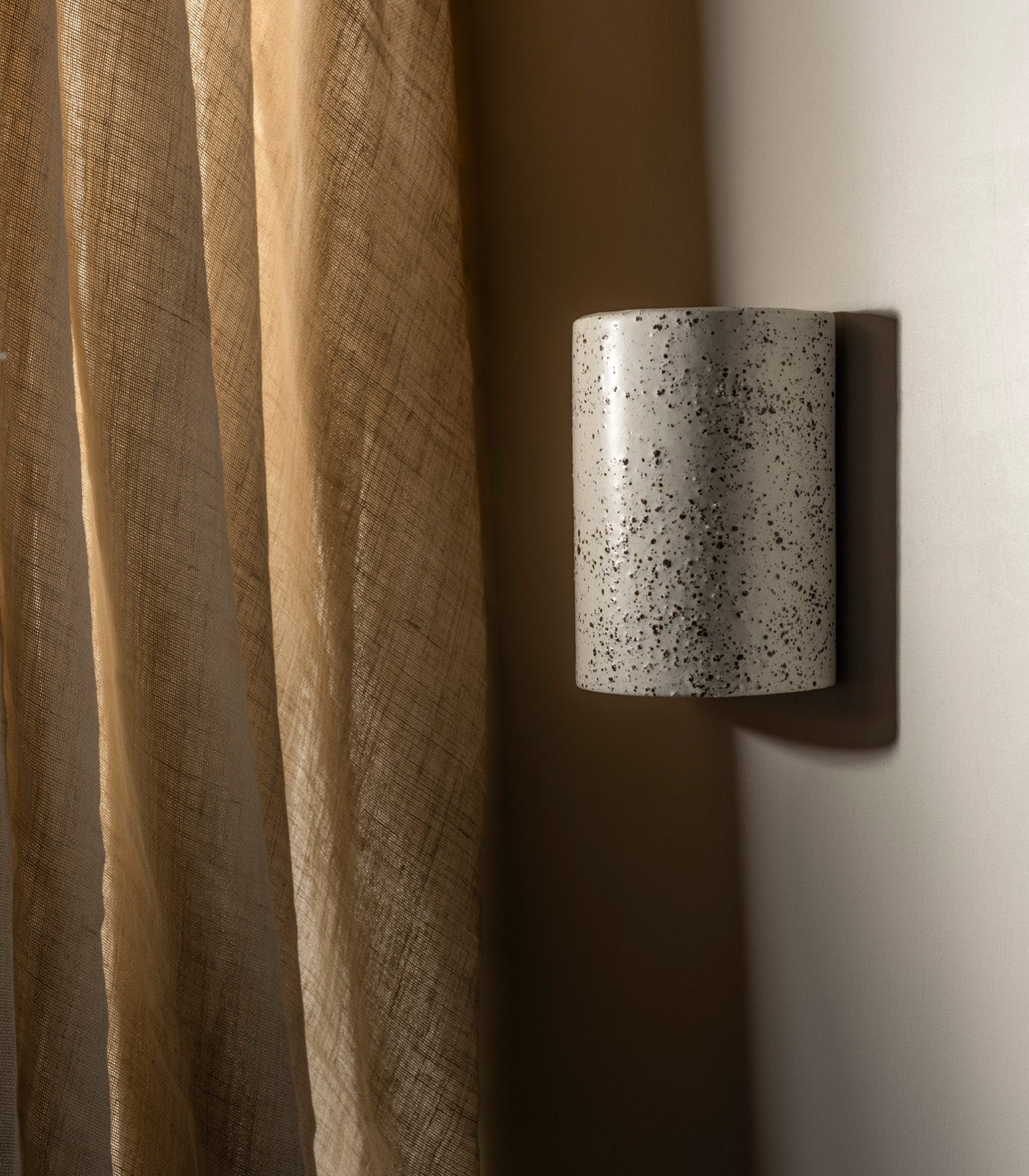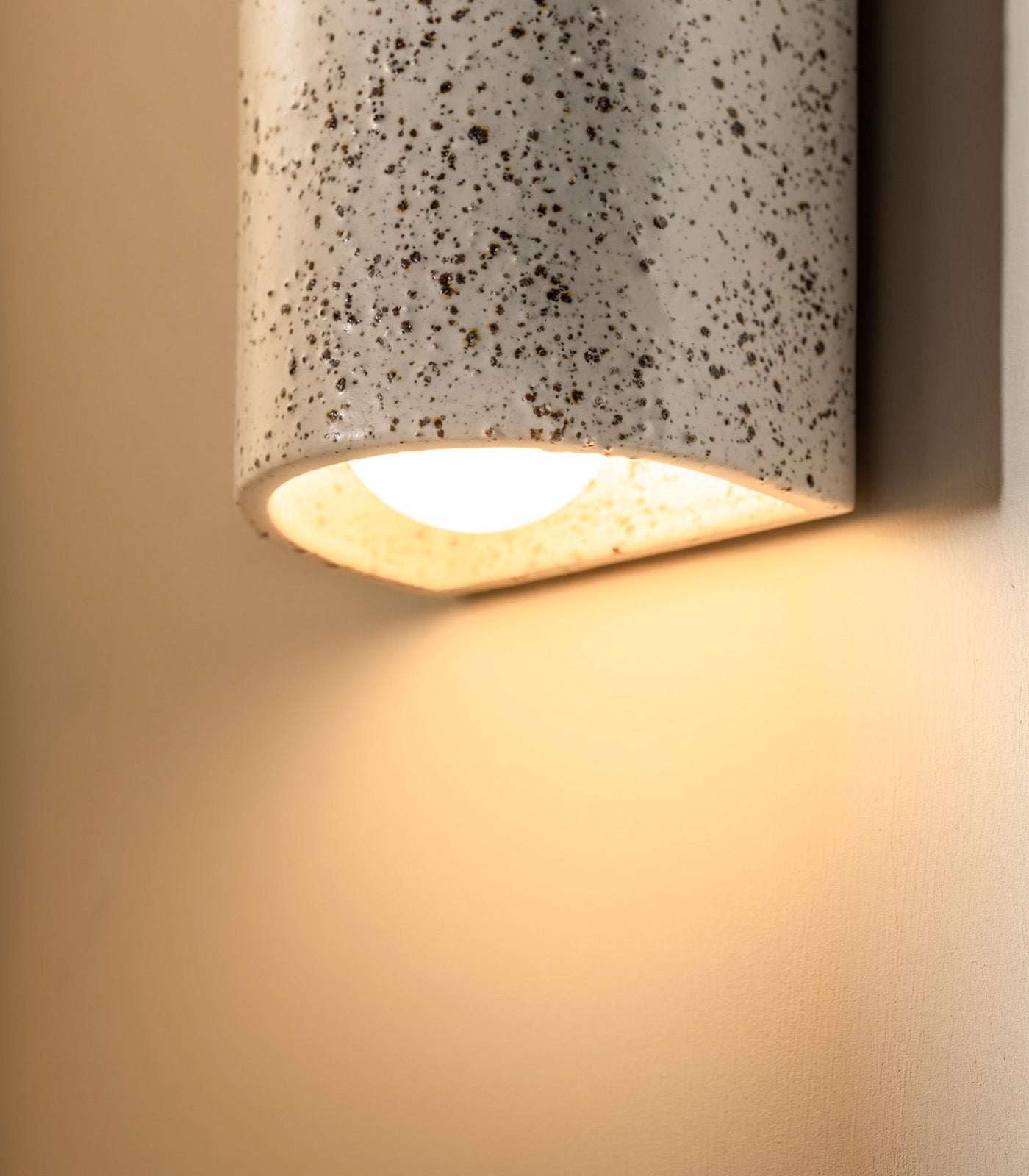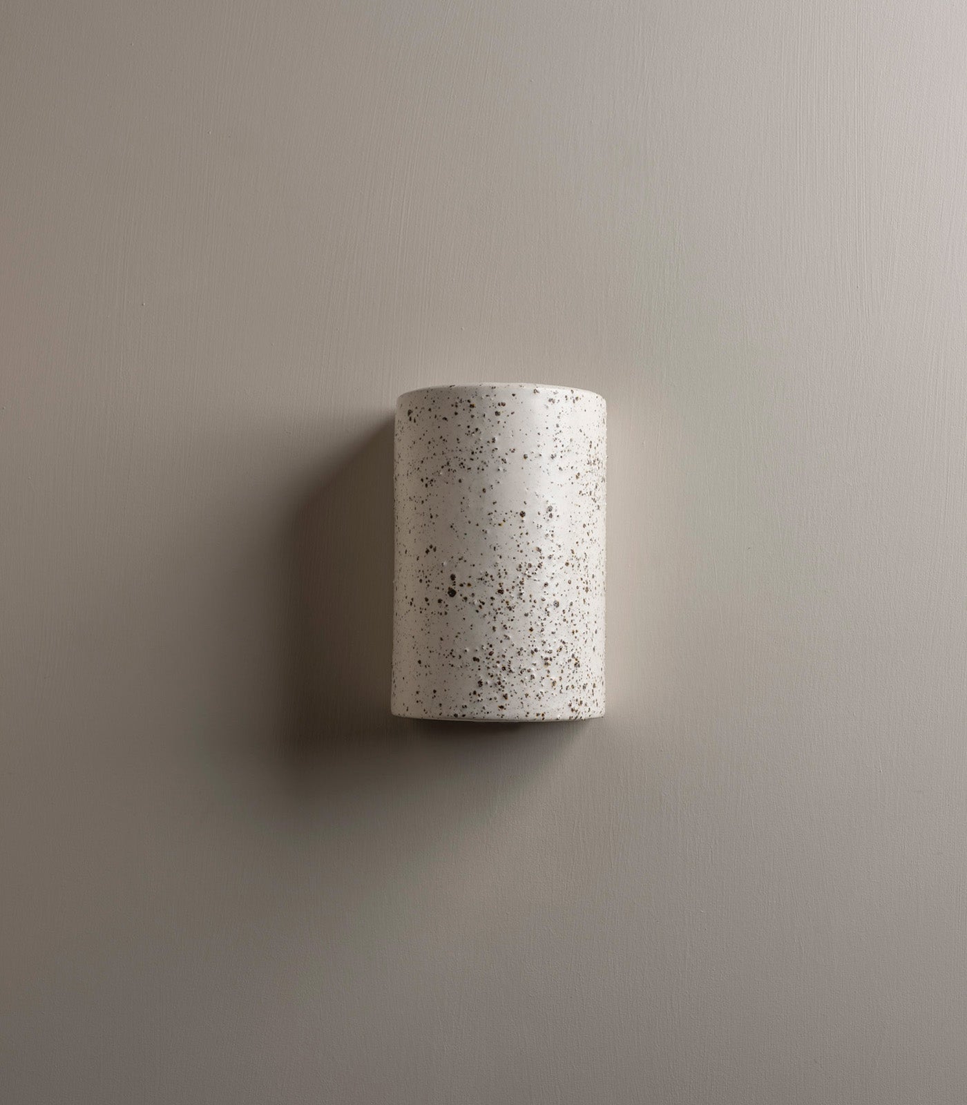 Dusk Short Outdoor Wall Light is designed to bring warmth and ambience to any exterior space by providing a subtle yet dynamic down light. The flecked ceramic is carefully dipped by hand into an eggshell white low sheen glaze and kiln fired twice at extreme temperatures to ensure a strong, robust durable form. Beautifully mounted on a near invisible custom IP Rated back plate, meaning your ceramic wall light hugs the wall tightly and is suitable for any wall finish.