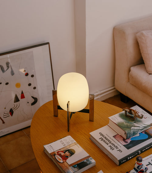 Cesta Metalica Table Lamp was born from a stroll through Barcelona in the 1960s, where designer Miguel Milá found an abandoned opal globe outside a glass factory. He took it home, and over the years, it became the heart of a large family. As its name suggests, Cesta (Spanish for “basket”) was designed to hold this fragile shade.