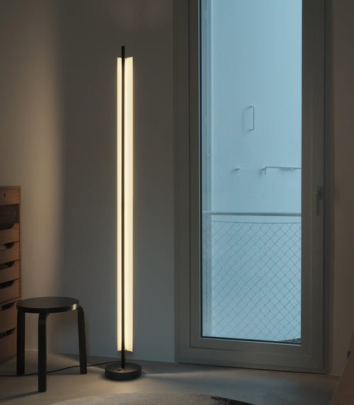 Lamina 45 Floor Lamp features a line of light and a thin metal sheet which creates a faint yet effective diffusion.