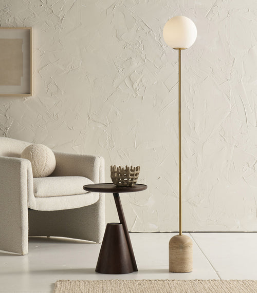 Mintu Floor Lamp is an elegant and sophisticated lighting fixture that exudes refinement and classic style. The lamp features a Travertine or Satin Black base, which adds a natural beauty to the overall design, along with a Frosted Glass Diffuser that creates a soft and diffused light, illuminating the surrounding space from all angles.