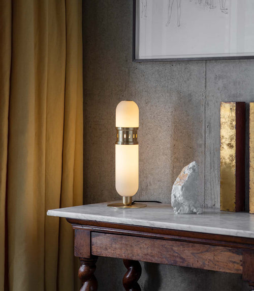 Occulo Side Table features a pill-shaped, sand-blasted glass shade and precision-etched brushed brass detailing. The pill-shaped opal shade glows with opulence, sitting tall and proud on a thick solid brass base. The capsule lamp will complete your desk or bedside table, with a practical grooved tray machined into the base.