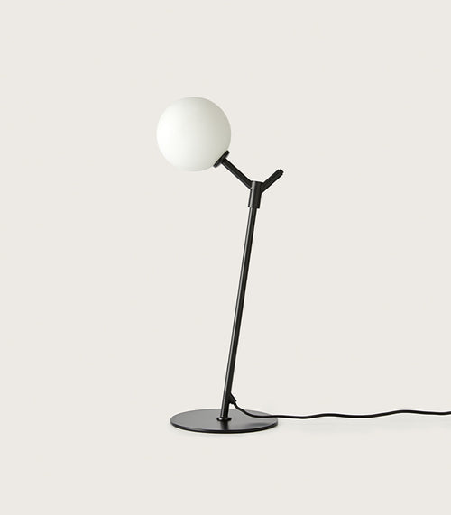 Snowball Table Lamp is a contemporary take on the classic Bauhaus lamp. The lamp’s metal stem is secured to a streamlined base, rising upwards to hold a lampshade made from frosted glass that rests in a disc-shaped plinth.