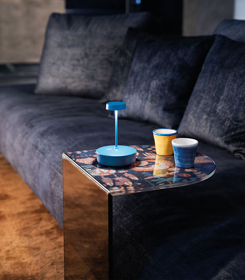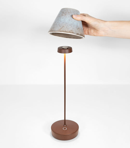 Swap Mini Ceramic Table Lamp by Zafferano Ai Lati Lights is a battery-operated, portable, rechargeable table lamp. It is equipped with a contact charging base and dimmer touch control.