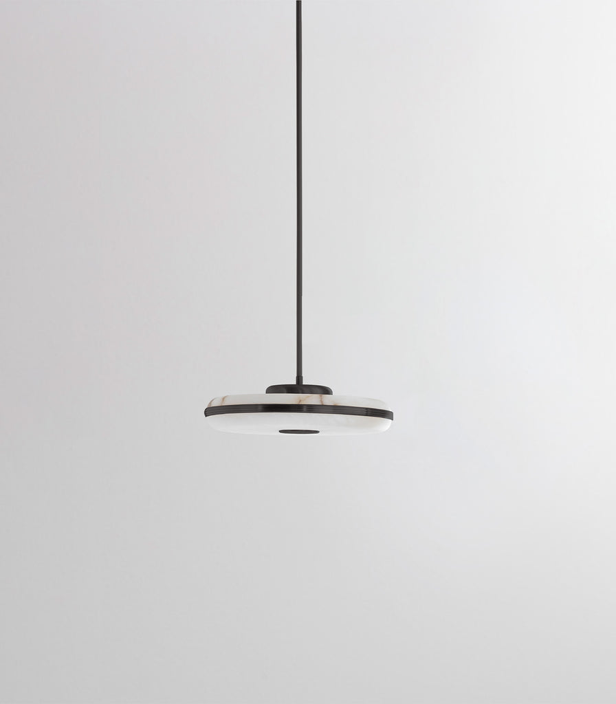 Beran Horizontal Pendant Light features a natural alabaster stone diffuser that has been merged with precision machined brushed brass and suspended from a solid brass stem, resulting in a graceful pendant light.