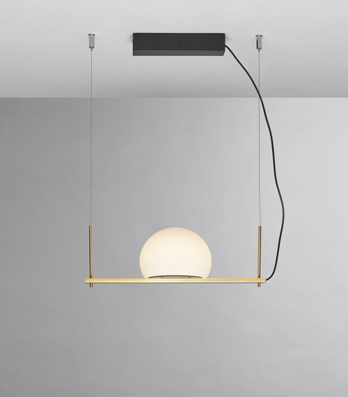Circ 2lt Linear Pendant Light is like an acrobat poised on a trapeze, perfectly balanced and versatile. A black or satin gold metallic suspension with two glass shades and an integrated dimmable LED provides both an indirect and direct light. It can be installed facing up or down, at an angle or even linked for a longer unit, bringing an extra element of flexibility.