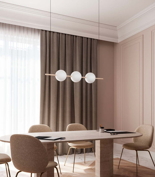 The light frame in Brass or Black is completed by a spherical opal white glass dome that hides the light source and spreads a soft glare free light into the room. Contina 3lt Pendant light is a linear suspension with three light sources adding warmth and cosiness.