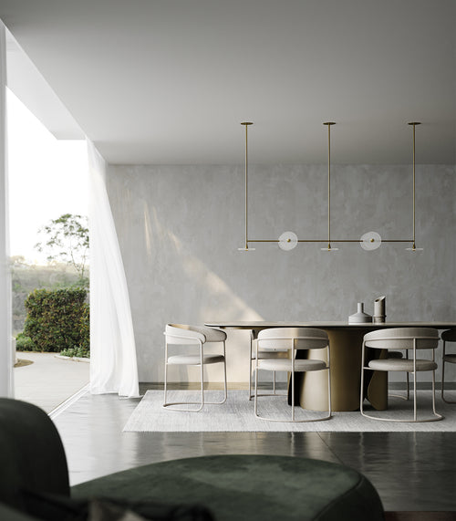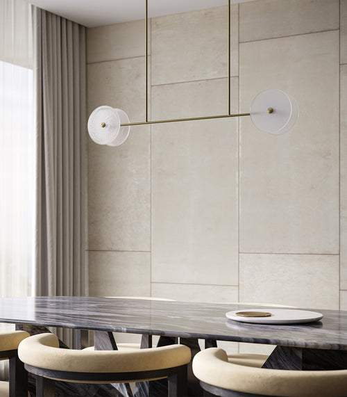 Elevate your space with the Coral Linear Rod pendant light, a captivating modern centrepiece perfect for dining spaces and over kitchen islands. Six exquisite glass-blown discs are suspended from a beautiful crafted rod structure, available in a selection of finishes including natural brass, steel finish, matte black, matte white, or medium bronze powder coating. Choose from a frosted or clear finish and set the mood of your space with a choice of warm, warm white, or white LED temperatures. Meticulously hand-blown using premium Swedish clear glass, each disc carries the distinctiveness of SOKTAS Glass designs, promising an unparalleled and personalised lighting masterpiece that adds both elegance and character to your space.