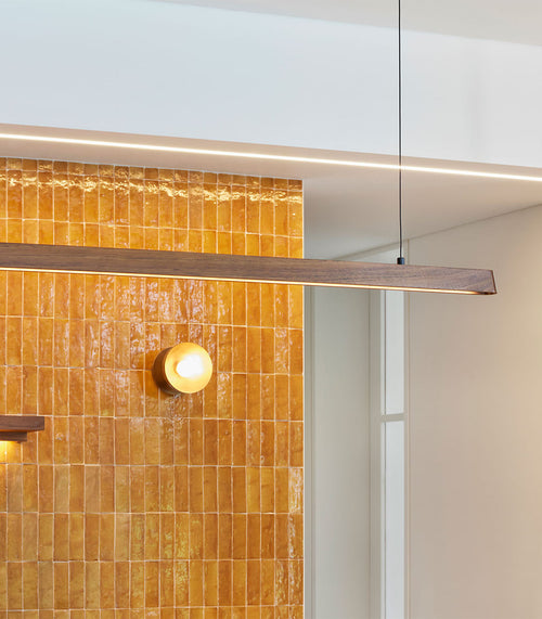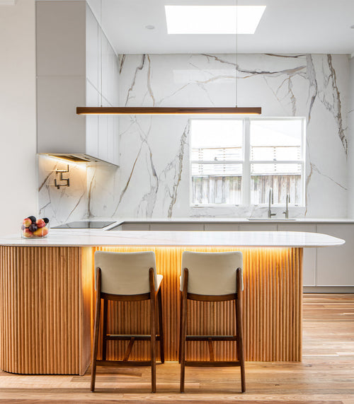 Fluted Roller Linear Pendant Light features a scolloped solid timber body. The fluted effect creates interesting timber grain detail, and defined highlights and shadows. Minimal LED strip lighting is recessed into the bottom of the timber piece, creating a detail rich minimal pendant light.