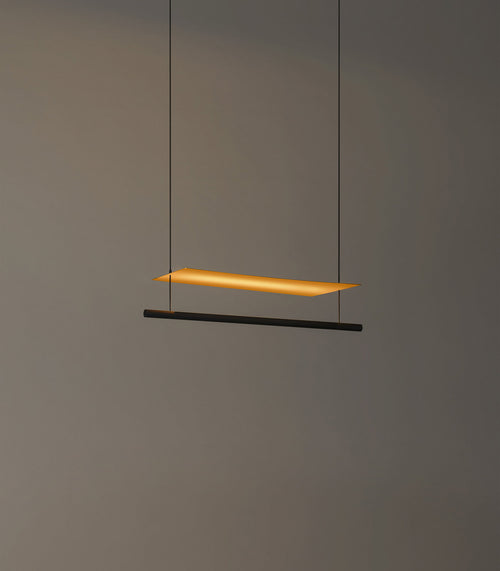 Lamina Mayor Pendant Light features a line of light and a thin metal sheet which create a soft but effective levity. A marriage of the poetic and the practical, Lámina is a system that upholds the benefits of reflected light by using obvious shapes in different formats and with different shades that conceal nothing and show everything.