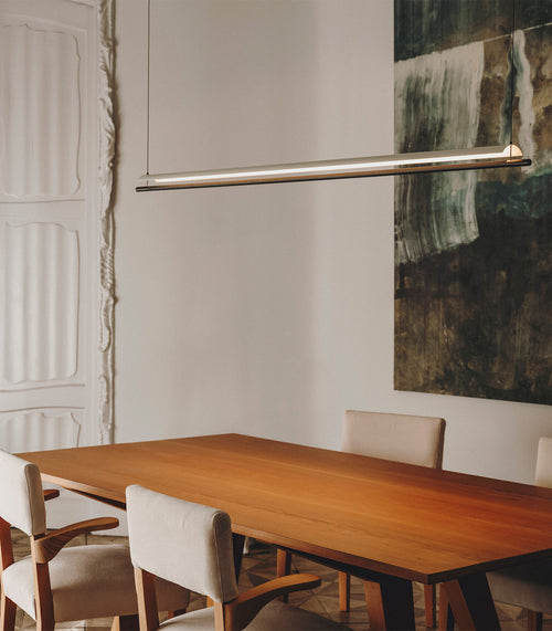 Lamina Pendant Light features a line of light and a thin metal sheet which create a soft but effective levity. A marriage of the poetic and the practical, Lámina is a system that upholds the benefits of reflected light by using obvious shapes in different formats and with different shades that conceal nothing and show everything.