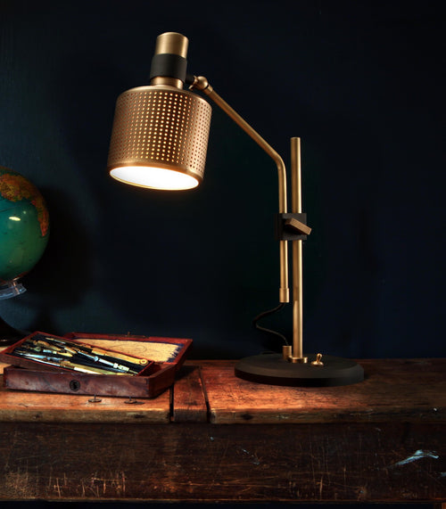 Riddle Double Table Lamp is simple in its complexity, a brass cup shade perforated with holes that display a subtle glow of light through the tiny holes. The Riddle Table Lamp is available in two sizes: a single light or double light.