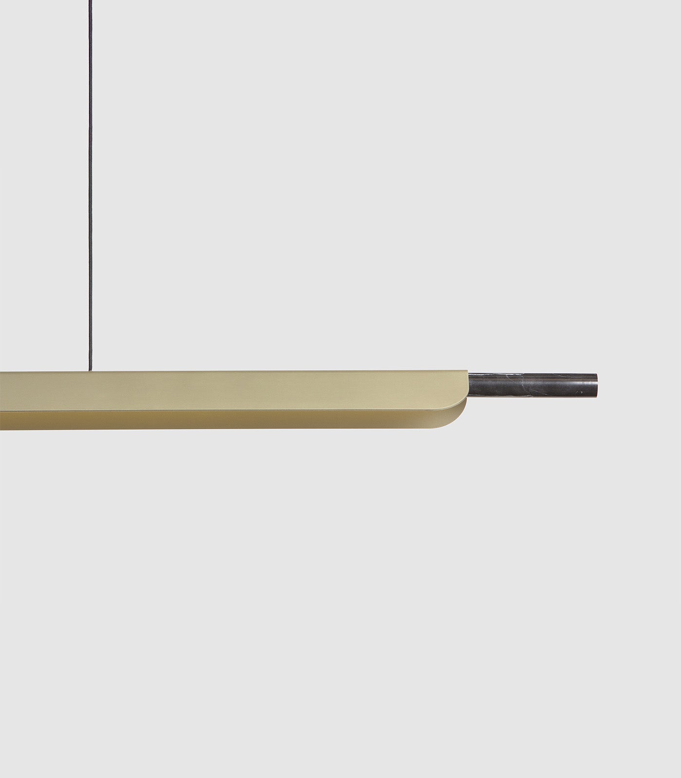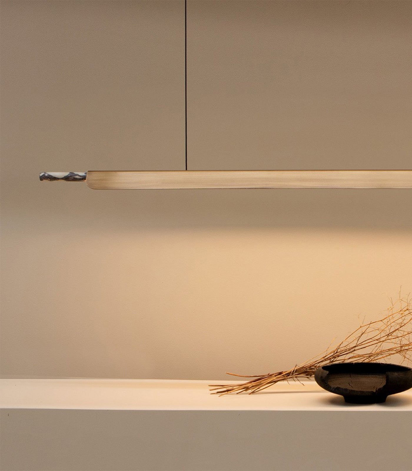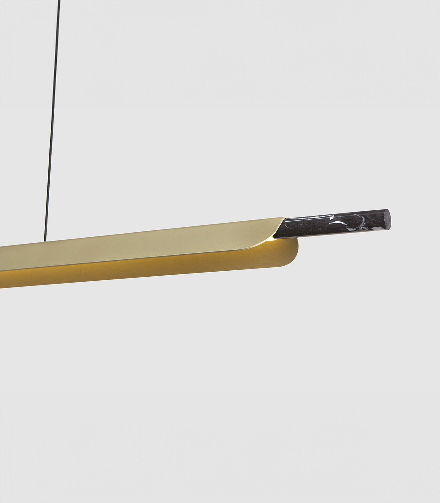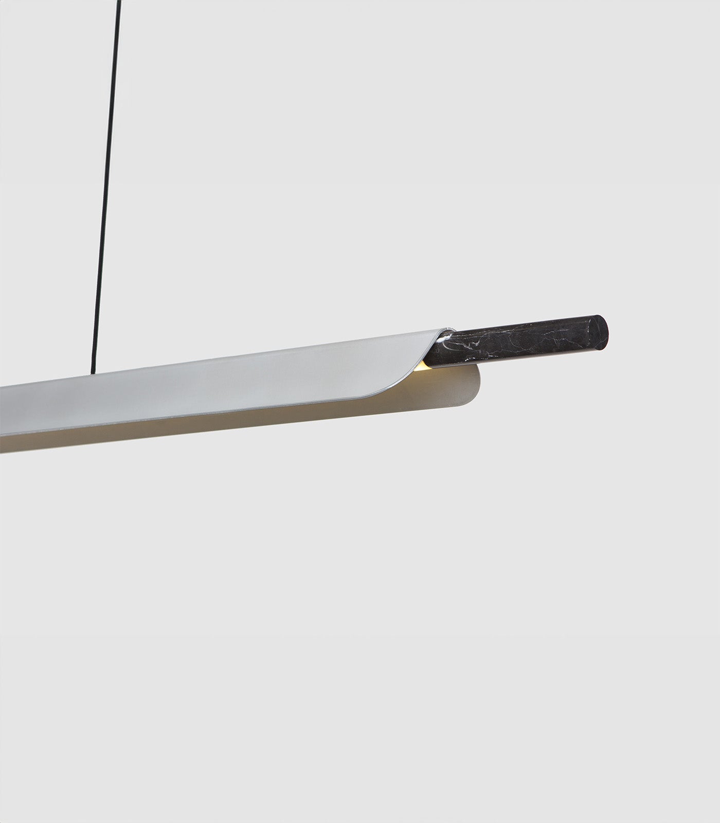 A linear pendant light ideally suited above kitchen islands and spanning longer tables. The light source is high-powered LEDs with a matte acrylic diffuser and a directional fin to prevent LED glare. A marble tip and highly refined details evoke a subtle sense of luxury.
