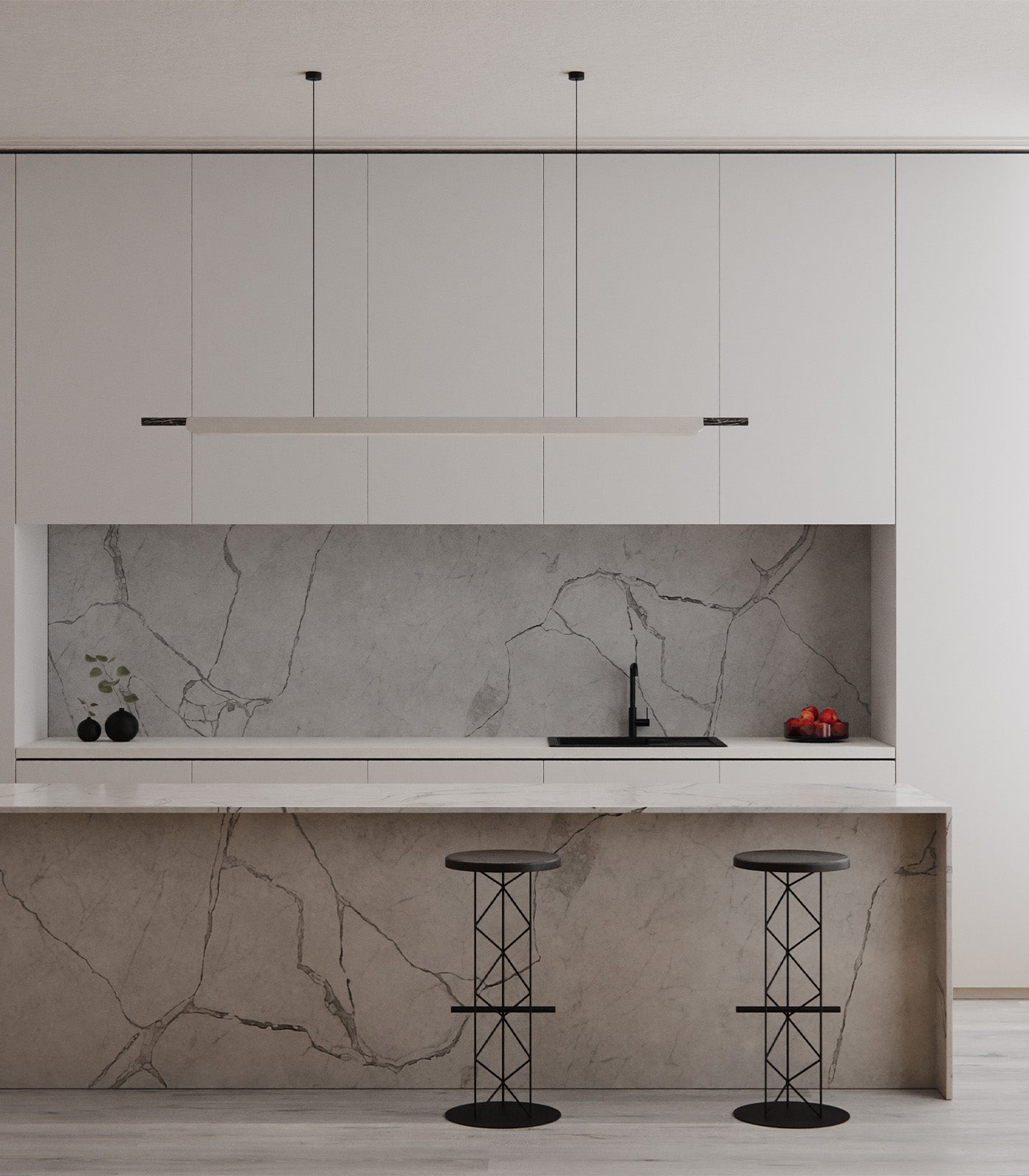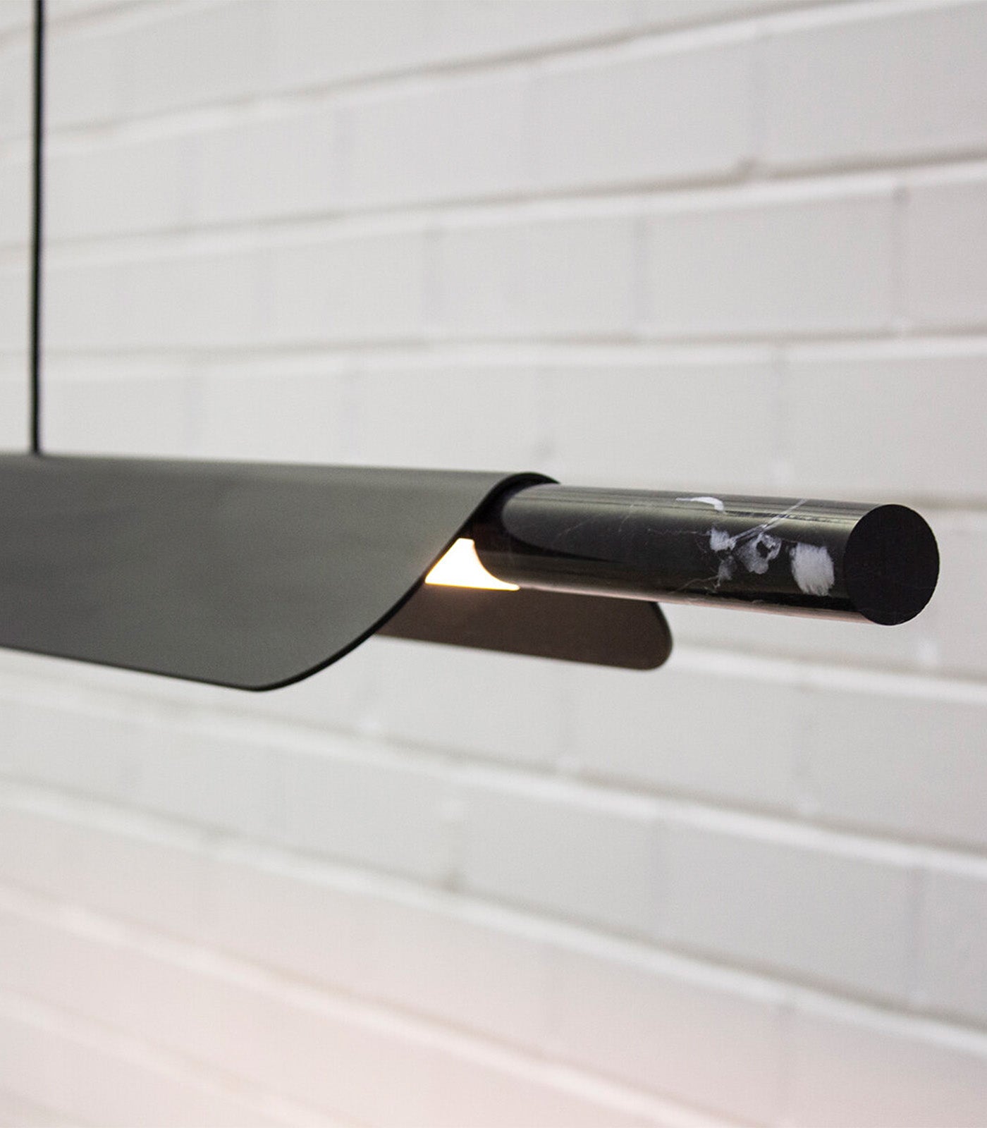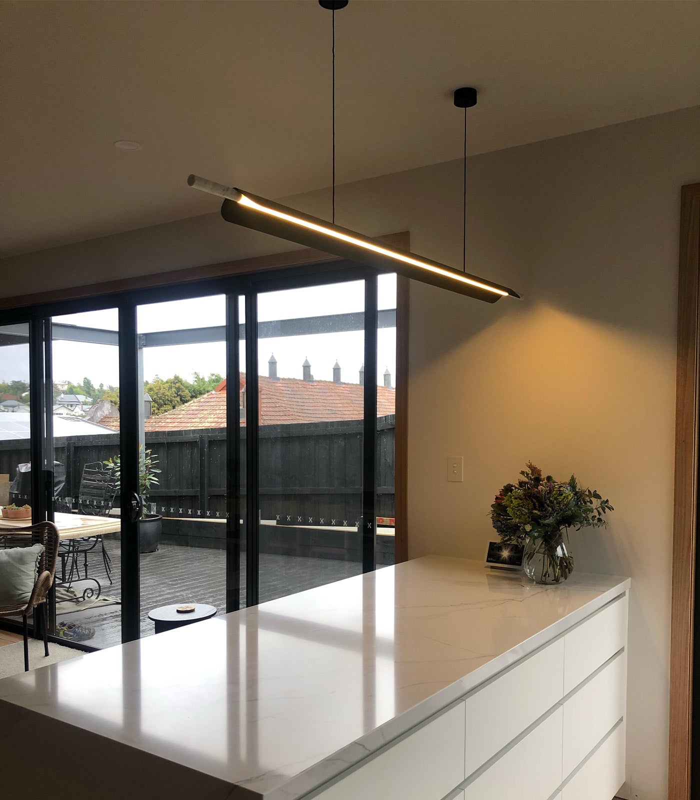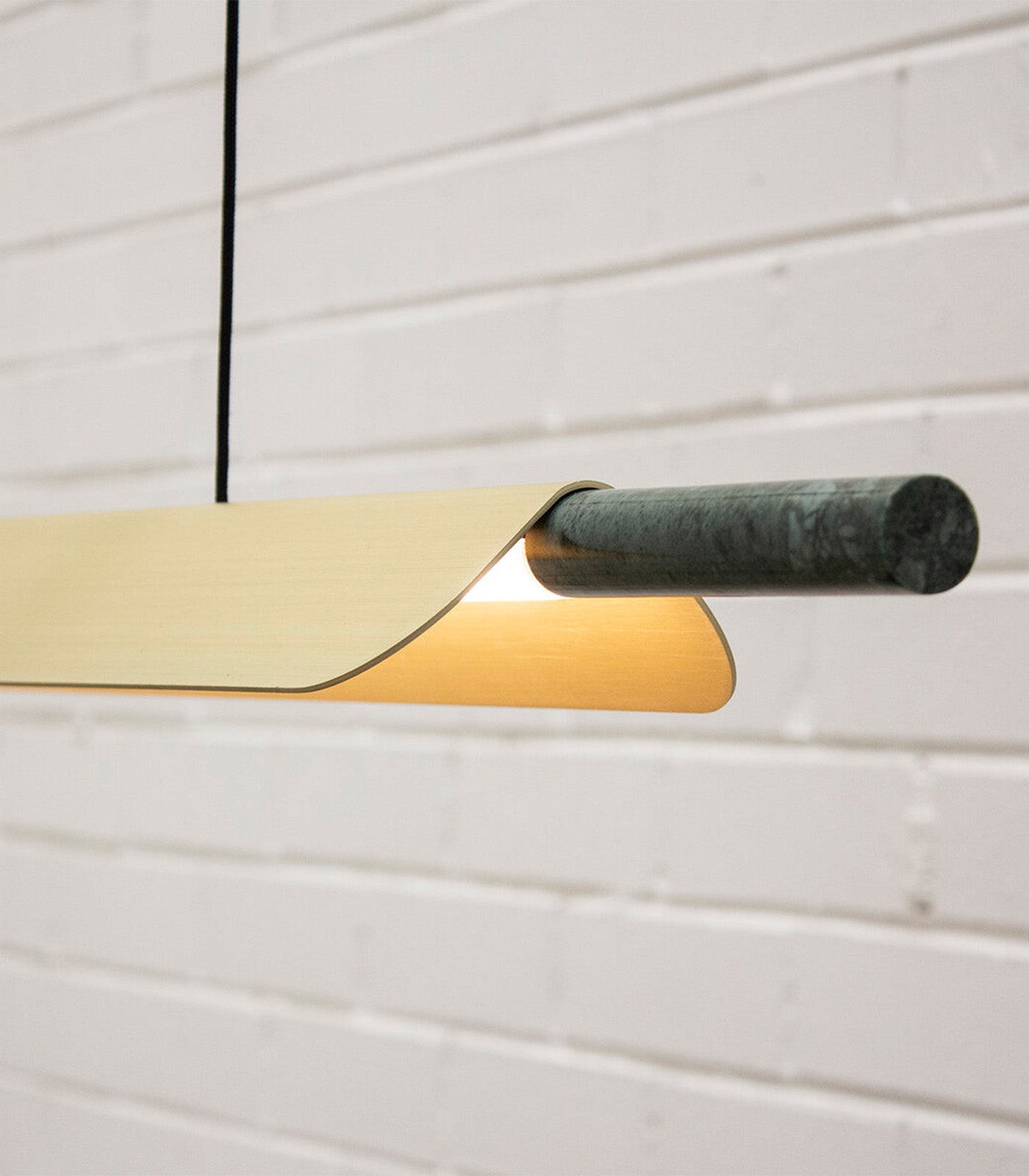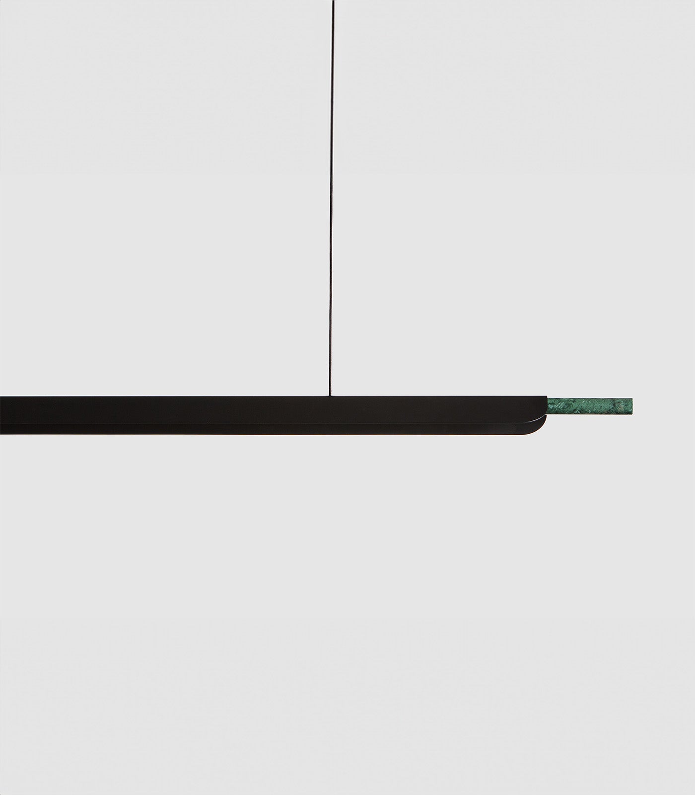 A linear pendant light ideally suited above kitchen islands and spanning longer tables. The light source is high-powered LEDs with a matte acrylic diffuser and a directional fin to prevent LED glare. A marble tip and highly refined details evoke a subtle sense of luxury.