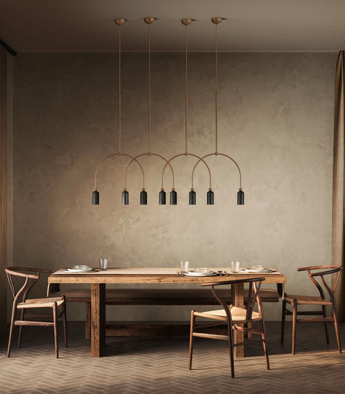 Arc Pendant Light has a clean and minimalist aesthetic. The arc itself can be rotated, adding an extra level of functionality. This contemporary pendant is available with either and aged gold or matte black finish.