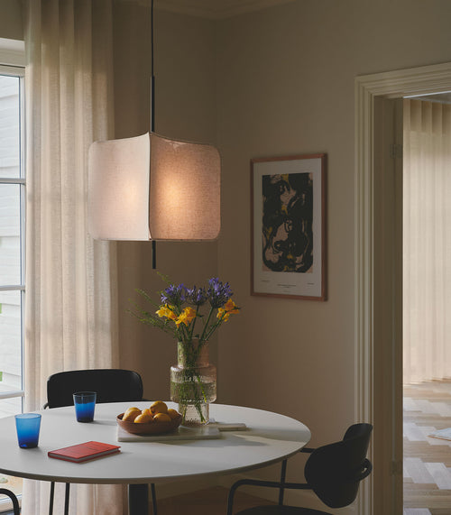 The Cardine series has a modern Japandi style that mixes elements from the Japanese interior philosophy with Nordic minimalism. The lightly crinkled paper shade is suspended by thin metal wires and ensures a pleasant, diffused light.