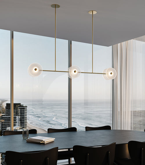 Elevate your space with the Coral Linear Rod pendant light, a captivating modern centrepiece perfect for dining spaces and over kitchen islands. Six exquisite glass-blown discs are suspended from a beautiful crafted rod structure, available in a selection of finishes including natural brass, steel finish, matte black, matte white, or medium bronze powder coating. Choose from a frosted or clear finish and set the mood of your space with a choice of warm, warm white, or white LED temperatures. Meticulously hand-blown using premium Swedish clear glass, each disc carries the distinctiveness of SOKTAS Glass designs, promising an unparalleled and personalised lighting masterpiece that adds both elegance and character to your space.
