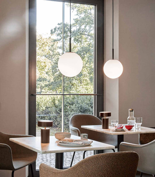 Ball Pendant Light incorporates the perennially popular sphere of glass and combines it with a sleek metal suspension to create a sophisticated and refined silhouette. The blown glass is available in a clear or opal finish and the metal fixture in a Matte Black or Matte Brass finish. A hugely versatile suspension, it will work equally well as an individual pendant or in an arrangement.