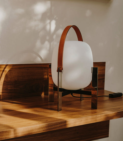 Cestita Metalica Table Lamp was born from a stroll through Barcelona in the 1960s, where designer Miguel Milá found an abandoned opal globe outside a glass factory. He took it home, and over the years, it became the heart of a large family. As its name suggests, Cesta (Spanish for “basket”) was designed to hold this fragile shade.