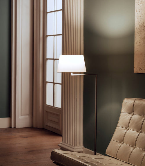 Fad Floor Lamp is a demonstration of industrial craftsmanship. Its cylindrical oak column creates a vertical symmetry that gracefully supports an almost cylindrical white linen shade. With no time for unnecessary adornment, FAD lamps are distinguished by their permanent elegance.