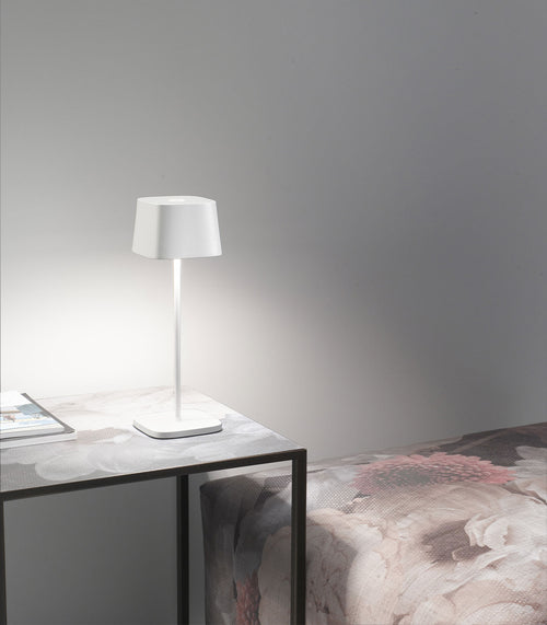 Ofelia Micro Table Lamp is made of painted die-cast aluminium with a polycarbonate diffuser. Suitable for outdoor (lamp IP65 rating) and indoor use (lamp on charging base IP20 rating).