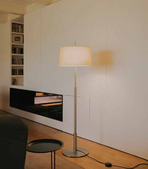 Pie de Salon Floor Lamp demonstrates the slender synthesis of traditional lamps with a sparkle of timeless elegance created in a context of the avant-garde. The combination of materials with its symmetrical, leather-wrapped chrome centre shaft make it a paradigm of industrial craftsmanship.