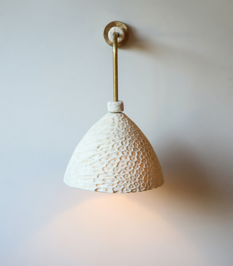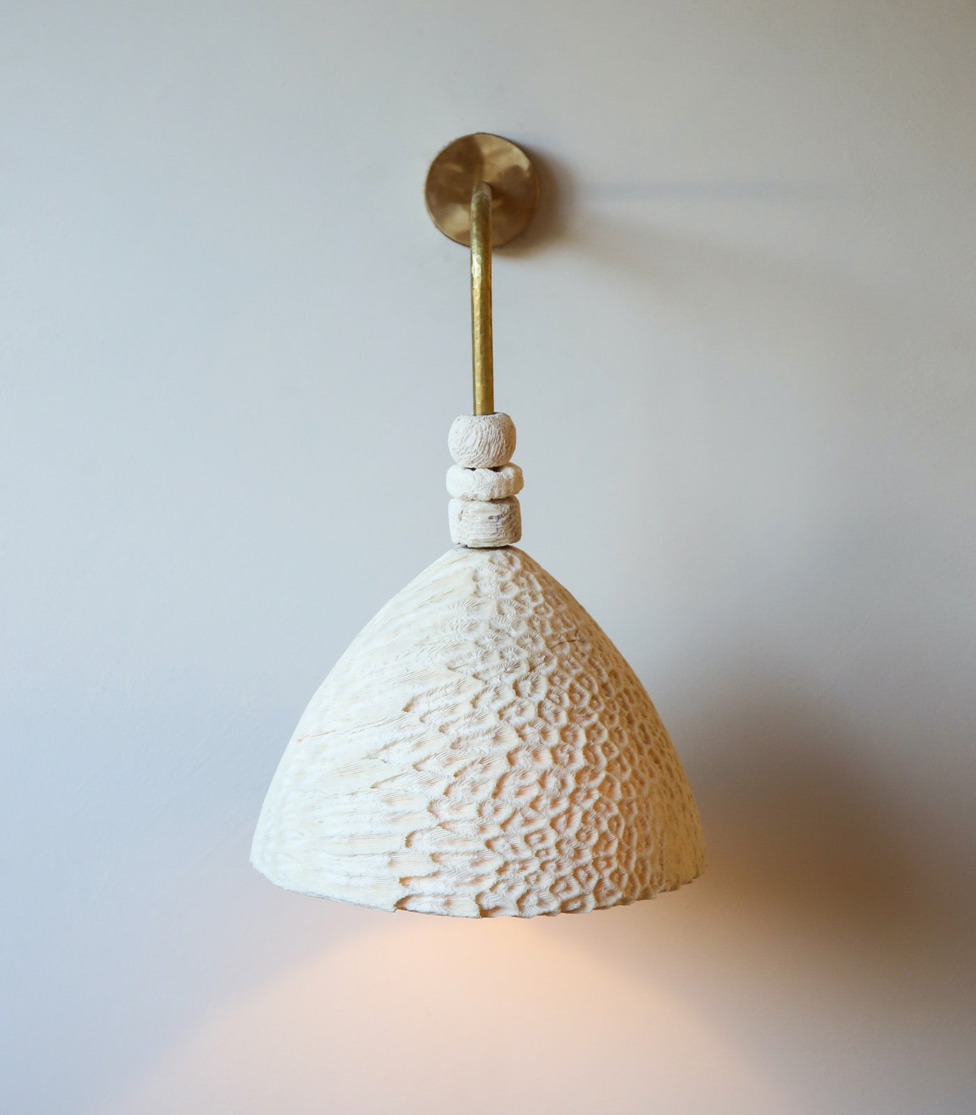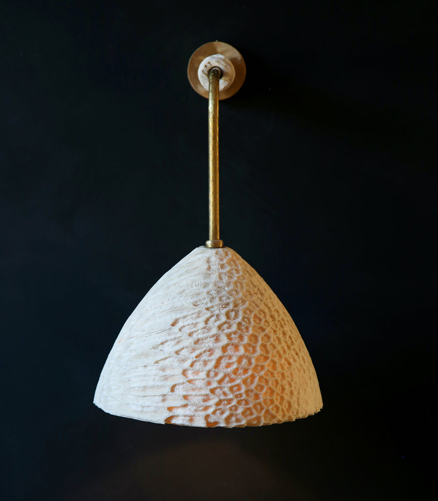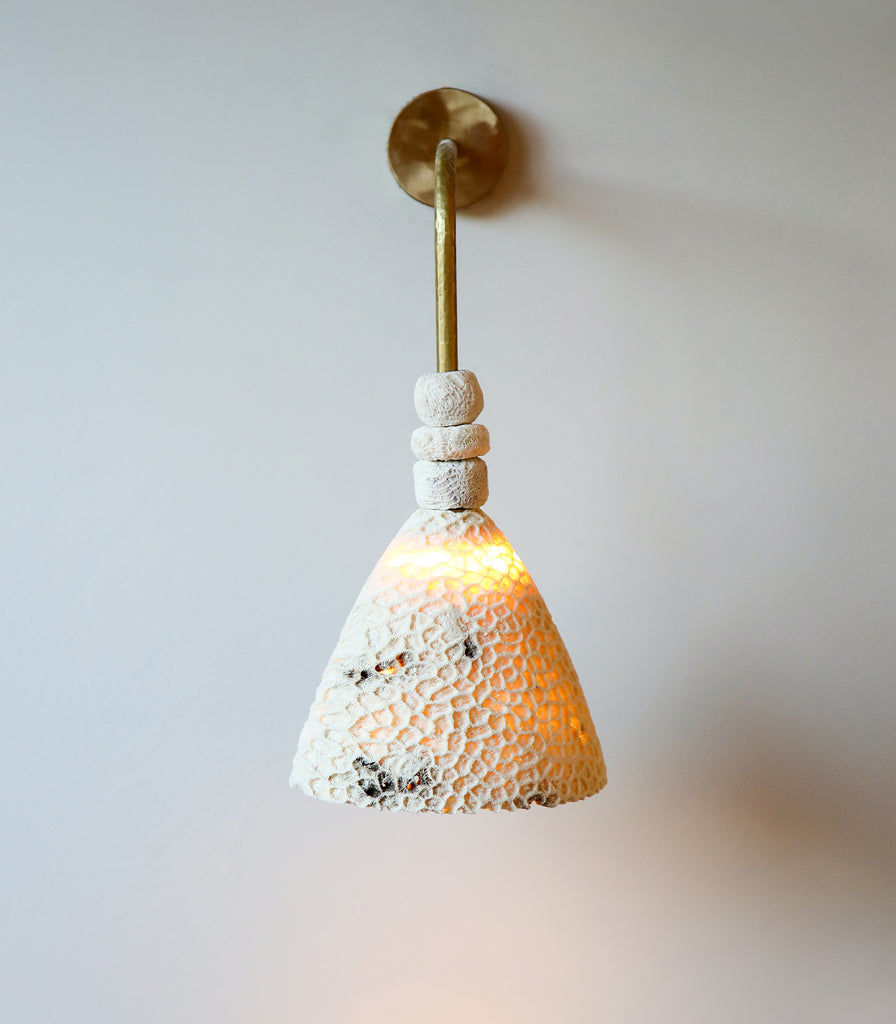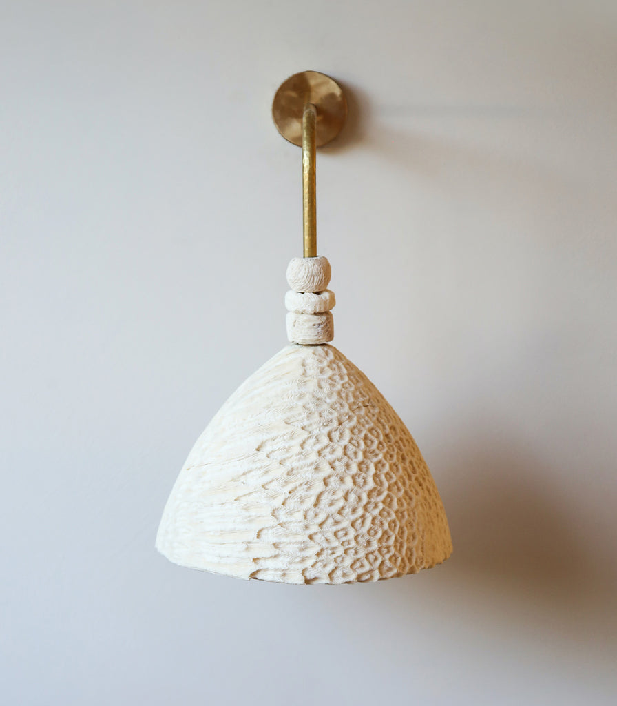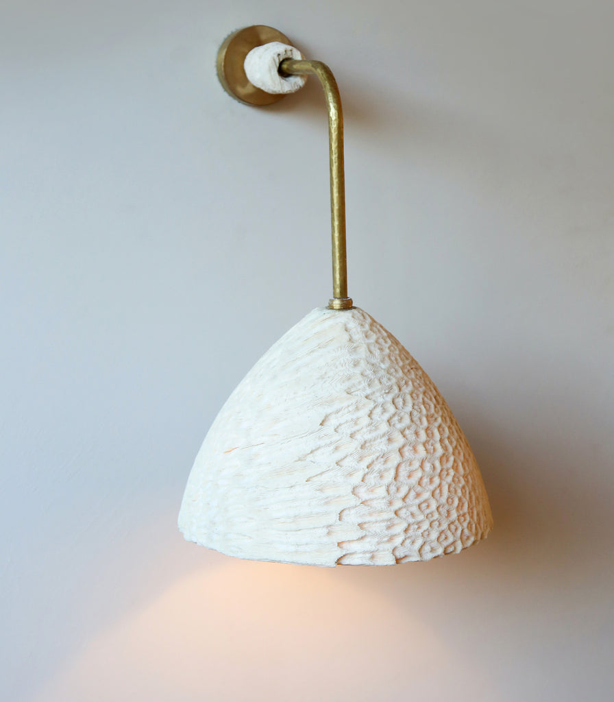 The Fossil Coral Cone Arc Wall Light by Marovo Island Traders is a hand-crafted artisan wall light, sculpted from authentic fossilised coral to showcase nature’s enduring textures. Its conical coral shade is suspended from a brass arc with coral detailing, casting a warm, ambient glow that enriches both modern and coastal-inspired interiors. With sustainable craftsmanship at its heart, this eco-friendly wall light merges natural artistry with timeless design, making it an elegant feature for luxury homes, boutique spaces, and architectural projects.