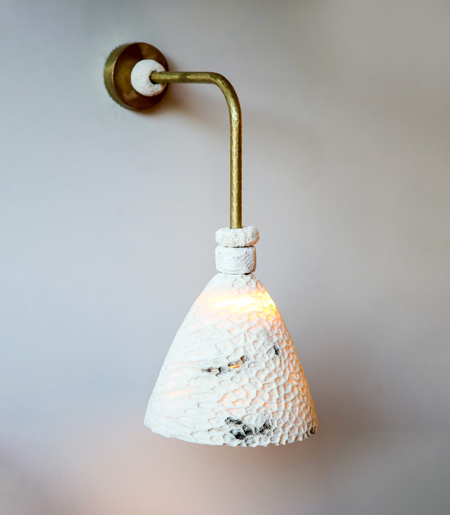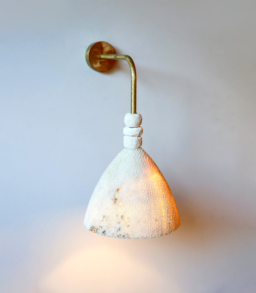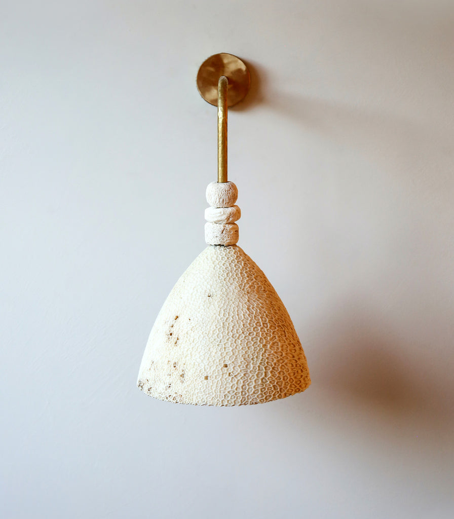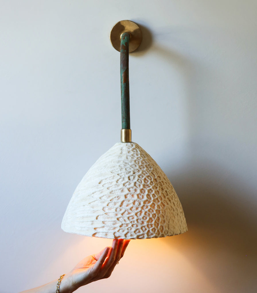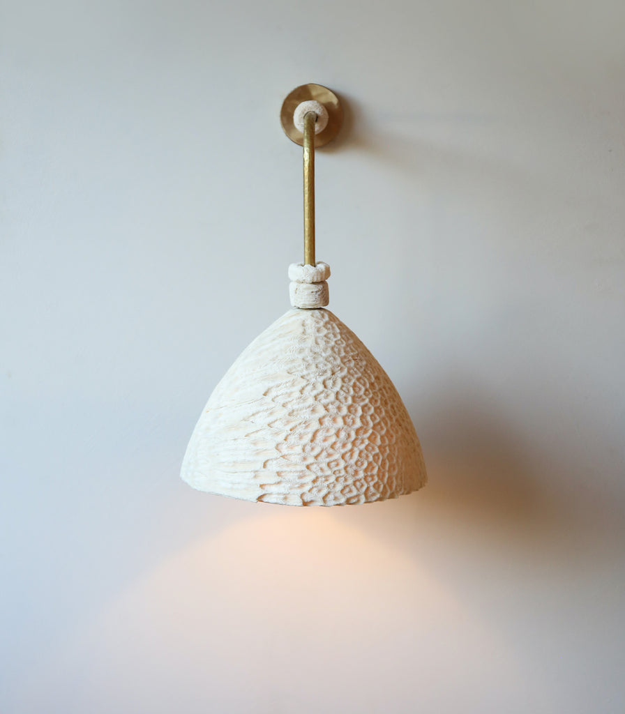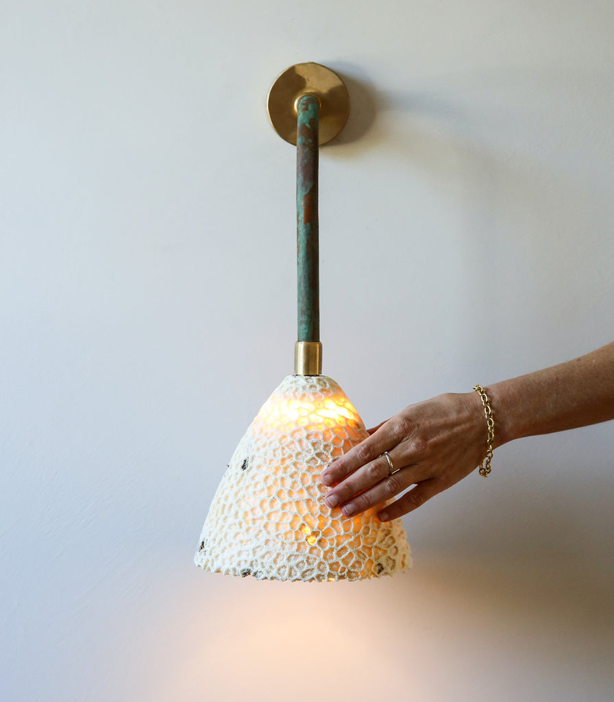 The Fossil Coral Cone Arc Wall Light by Marovo Island Traders is a hand-crafted artisan wall light, sculpted from authentic fossilised coral to showcase nature’s enduring textures. Its conical coral shade is suspended from a brass arc with coral detailing, casting a warm, ambient glow that enriches both modern and coastal-inspired interiors. With sustainable craftsmanship at its heart, this eco-friendly wall light merges natural artistry with timeless design, making it an elegant feature for luxury homes, boutique spaces, and architectural projects.