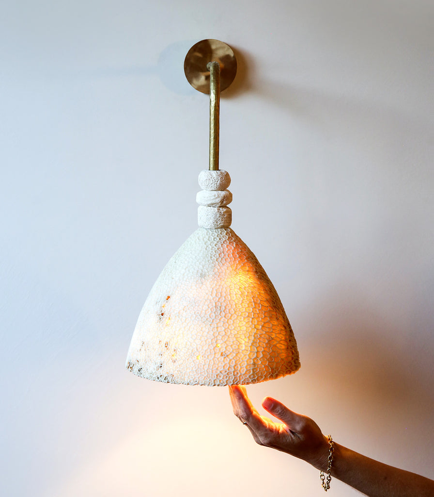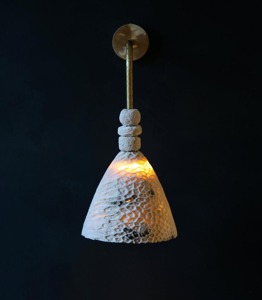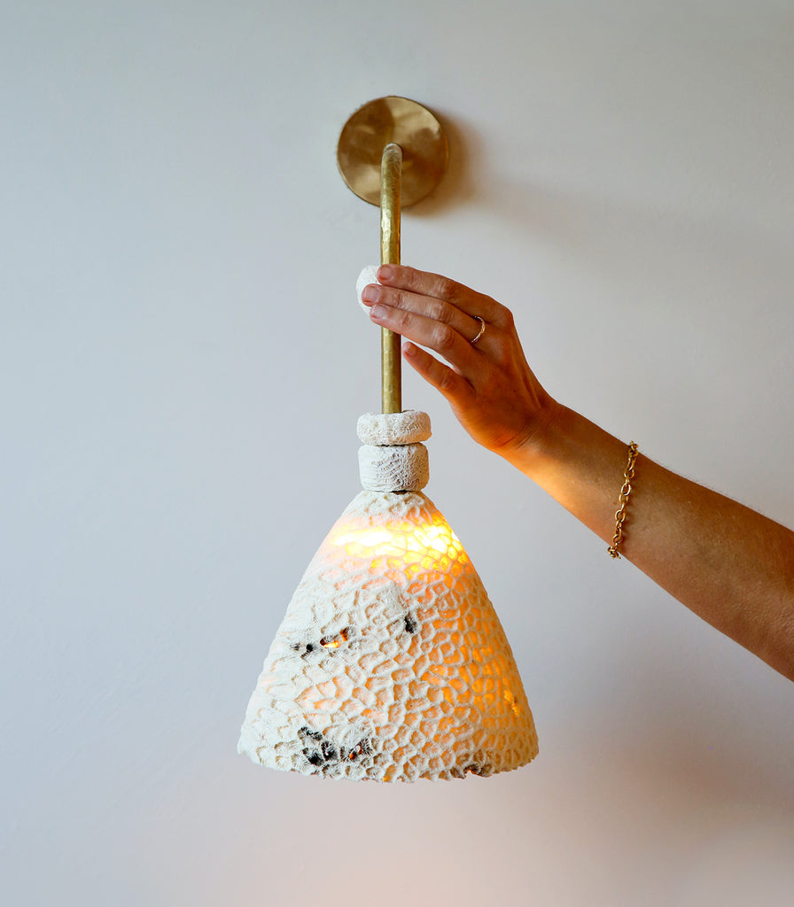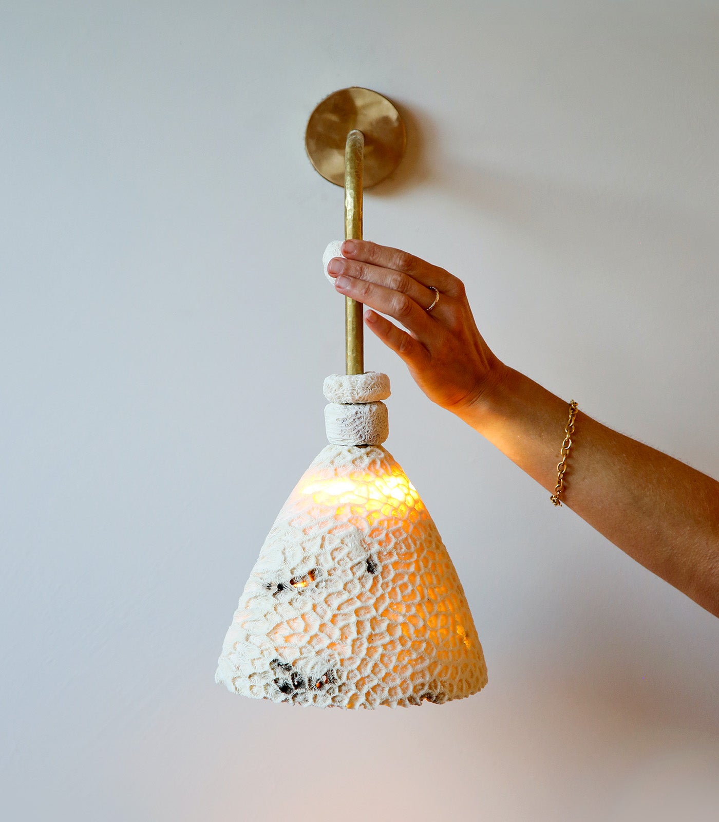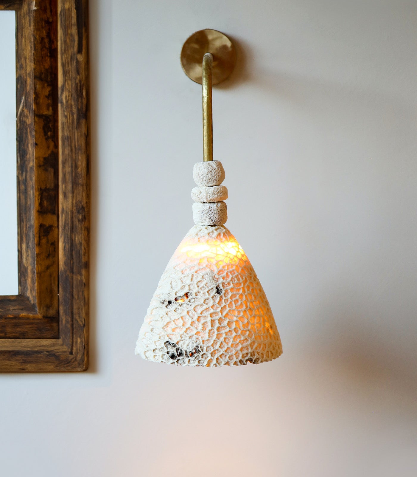 The Fossil Coral Cone Arc Wall Light by Marovo Island Traders is a hand-crafted artisan wall light, sculpted from authentic fossilised coral to showcase nature’s enduring textures. Its conical coral shade is suspended from a brass arc with coral detailing, casting a warm, ambient glow that enriches both modern and coastal-inspired interiors. With sustainable craftsmanship at its heart, this eco-friendly wall light merges natural artistry with timeless design, making it an elegant feature for luxury homes, boutique spaces, and architectural projects.