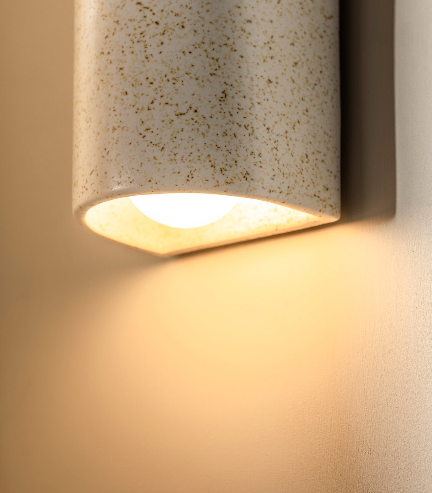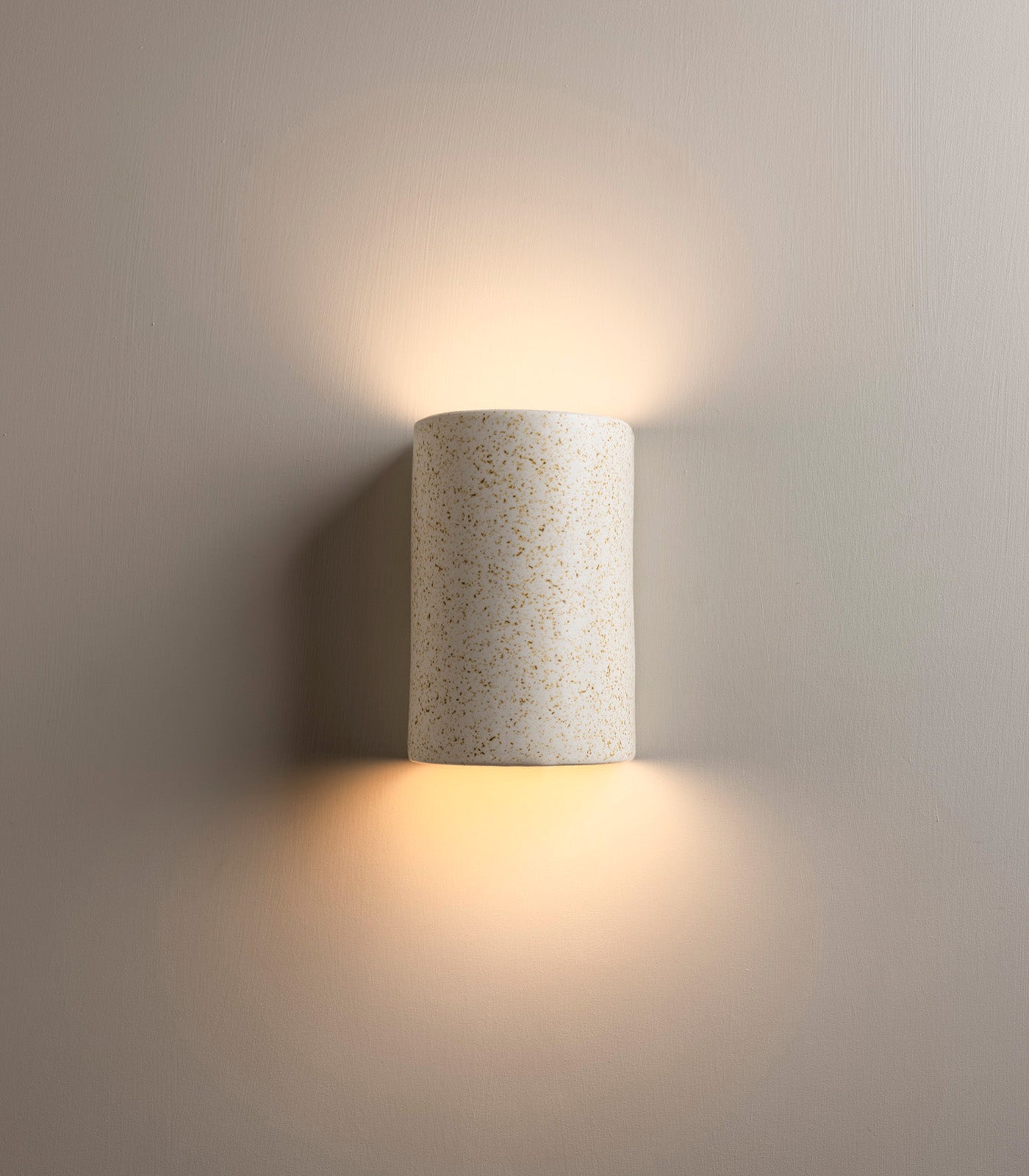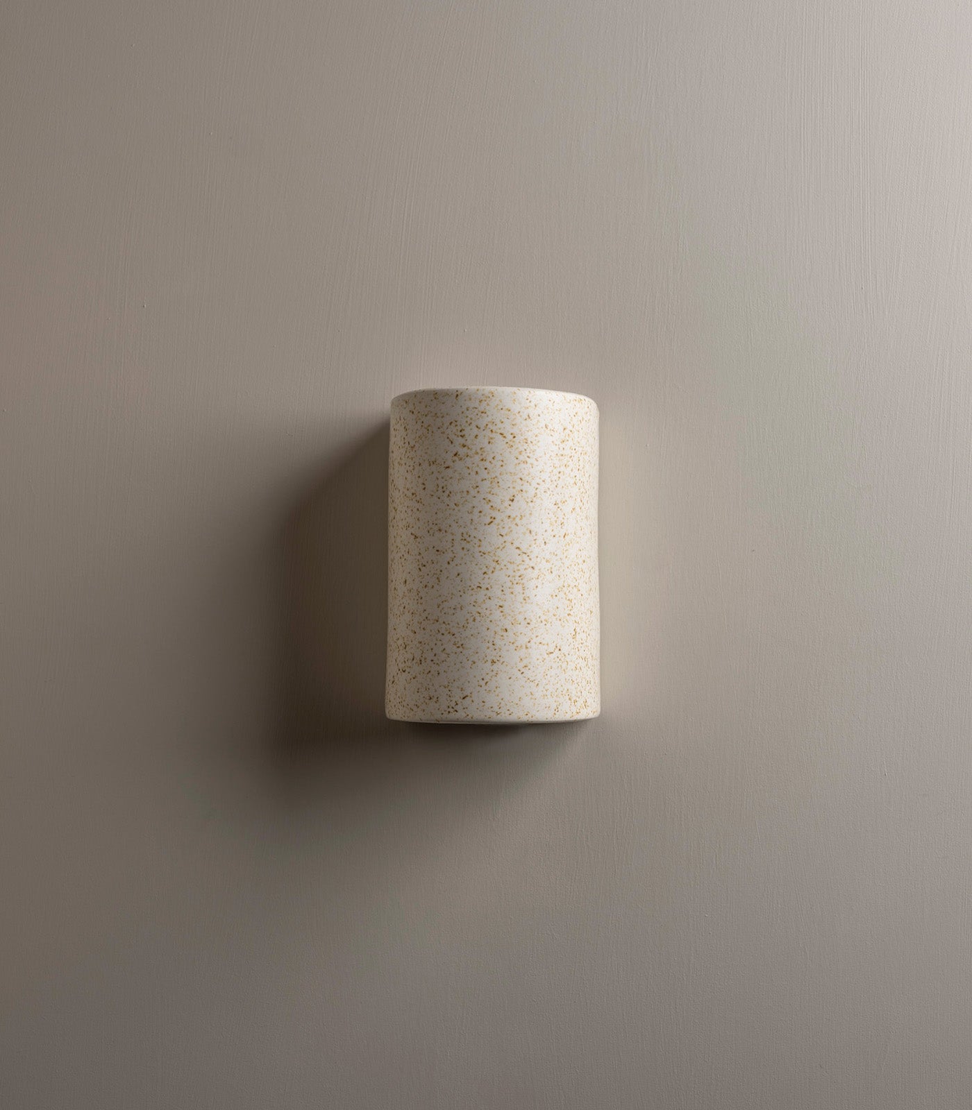 Freckles Short Wall Light is made in Tasmania and designed to bring warmth and ambience to any interior space by providing a subtle yet dynamic down light and striking silhouette. Freckles is created by using our makers secret formula glaze technique. Iron Oxide is suspended in a subtle low sheen white glaze creating a stunning chemical reaction that forces a subtle warm freckle finish - like the light has been kissed by the sun!