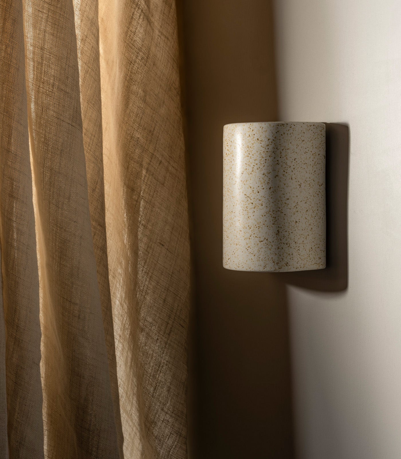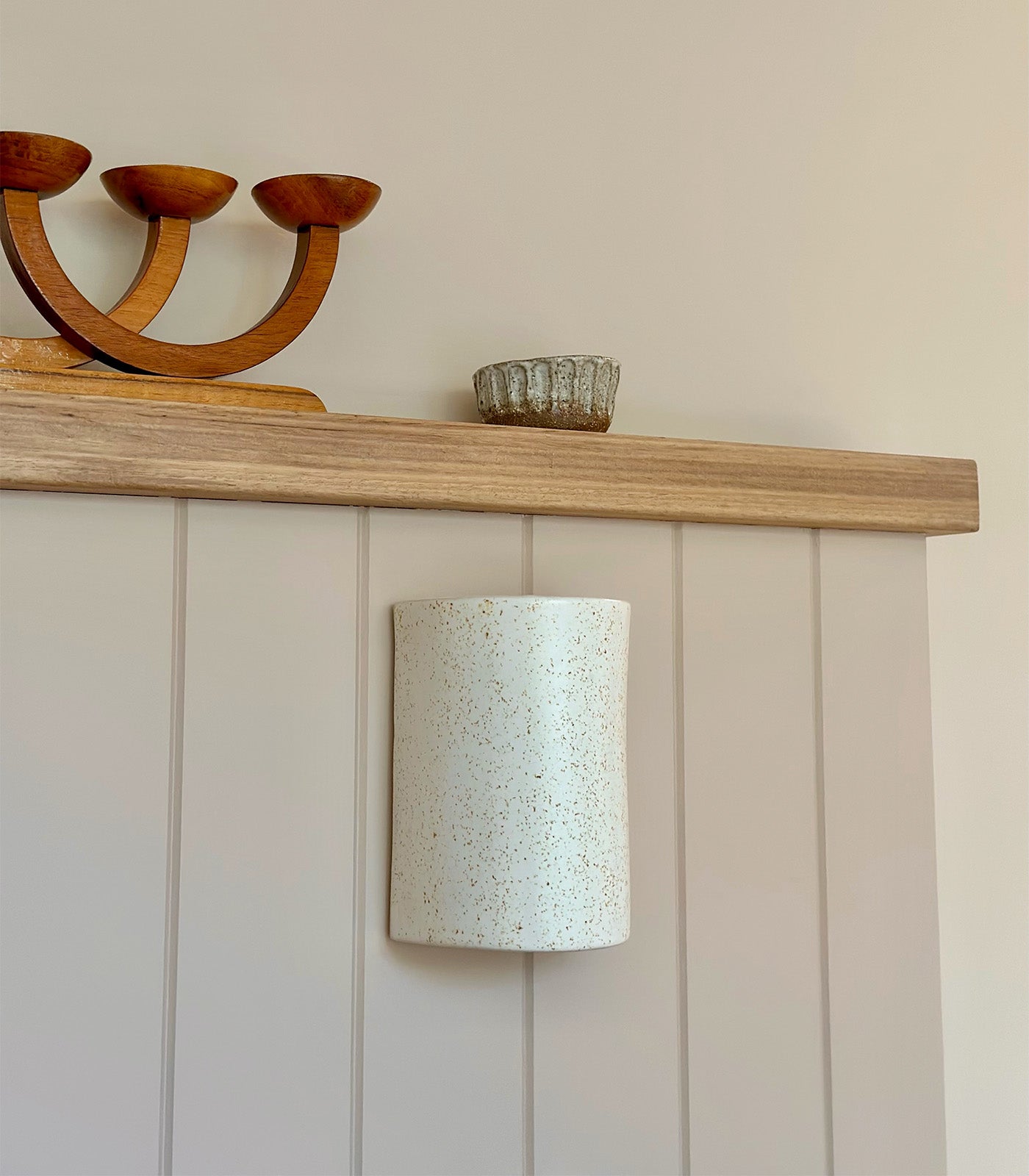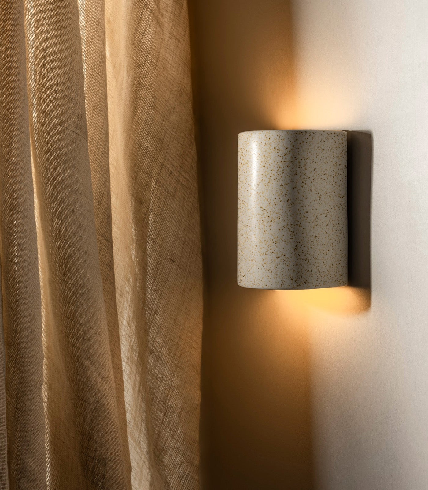 Freckles Short Wall Light is made in Tasmania and designed to bring warmth and ambience to any interior space by providing a subtle yet dynamic down light and striking silhouette. Freckles is created by using our makers secret formula glaze technique. Iron Oxide is suspended in a subtle low sheen white glaze creating a stunning chemical reaction that forces a subtle warm freckle finish - like the light has been kissed by the sun!