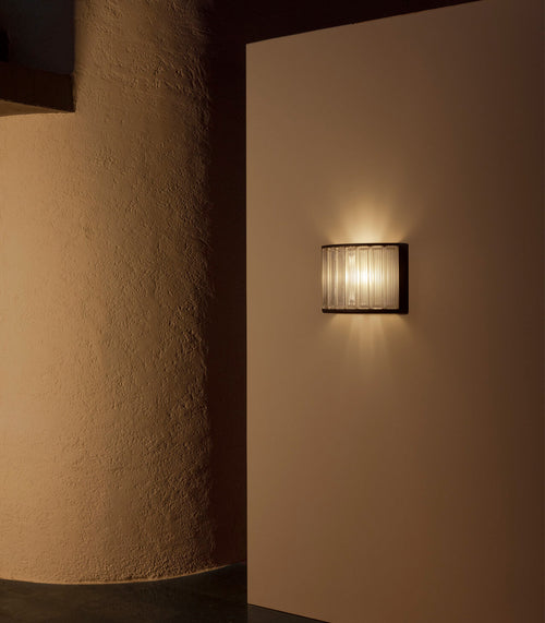 Estadio Singular Wall Light, part of the Estadio family, evolves from a ring to a single, simple column to satisfy new functions. A discreet aluminium body, in black or white, holds the historic glass brick. Solid and adapted for outdoor use, its repetition delimits the perimeter and points the way forward, both inside and out.