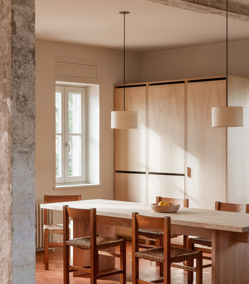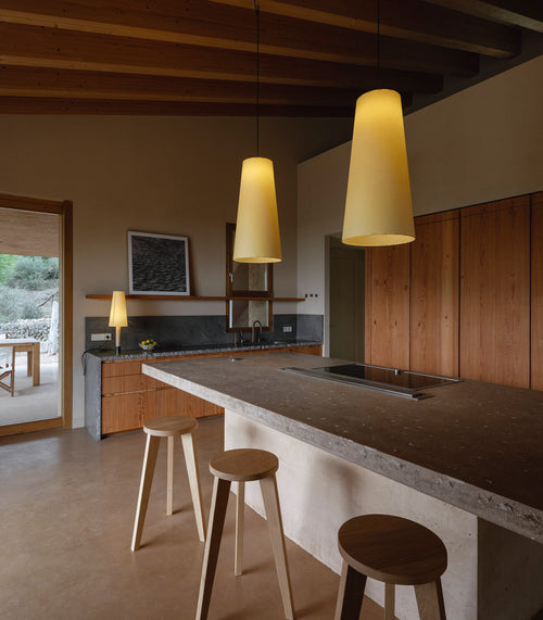 Sisisi Conicas Pendant Light features a conical shade made of stitched cardboard or linen, ideal for spaces where a warm and generous light projection is desired. This versatile light is both timeless and elegant. Available in four sizes from small to extra large.