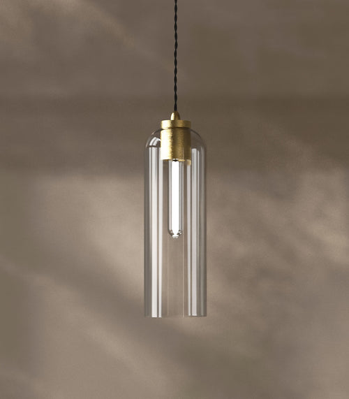 Amp Large Pendant Light is part of a collection inspired by old tube amplifiers from the 1960s. The unique shapes and classic materials of marble and glass add a nostalgic and contemporary feel. The decorative bulb emits a stunning glow through the gold/green and smoke/black glass lampshades, while the opaqueness of the White/White glass highlights the shape of the lamp, making it appear as a pure and ghostly aesthetic silhouette.