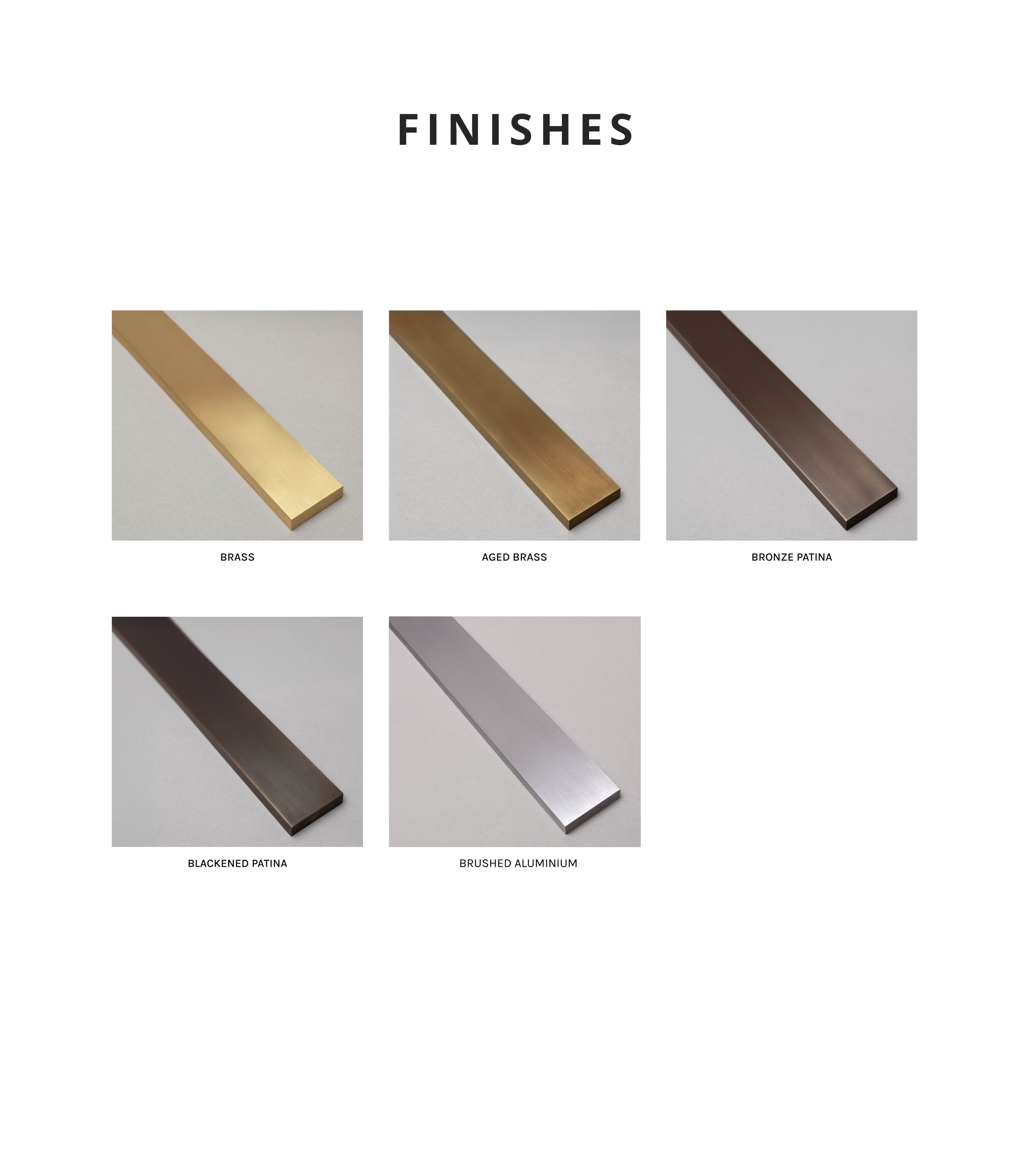 | Finish | Brushed Brass, Antique Brass, Bronze Patina, Blackened Patina or Brushed Aluminium |