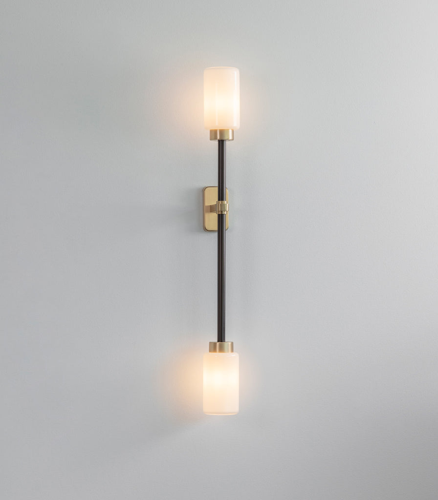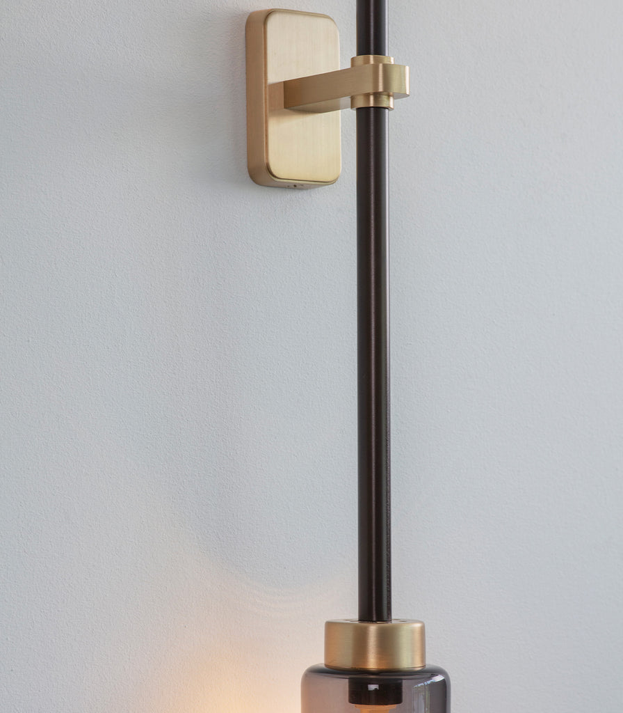 Farol Single Wall Light is finished in brass and bronze with two elegant cylindrical shades to lend a touch of luxury to any living space. The Farol Wall light is available as a single or double and has the option of either opal or smoked glass shades.