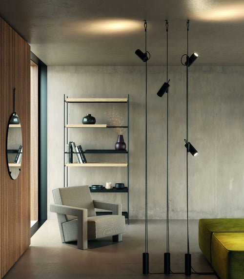 Filomena Hanging Floor Lamp is a simple black aluminium cone. The system branches out from this core element towards the ceiling and wall; which can be suspended from different heights by means of a long, thin cable.