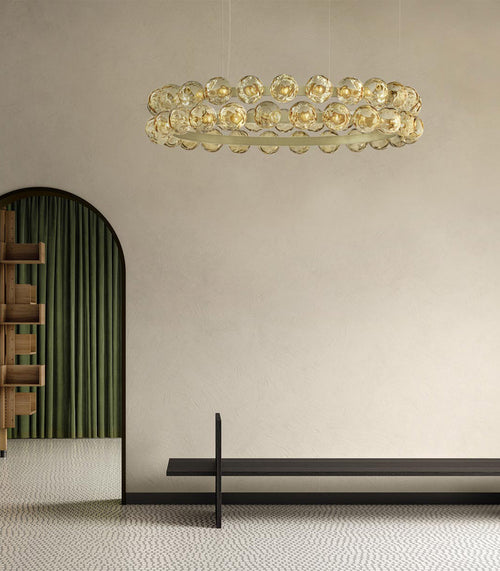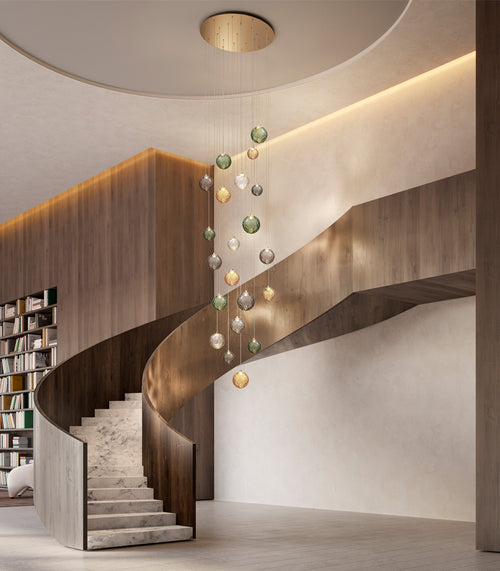 The tradition in the hand-made craftsmanship of blown glass gives birth to Murané, a series of fittings to install as individual suspensions or customised clusters, on surface or as partially recessed wall-ceiling mount fitting. The spherical diffuser transparent in glass, in different colours, is hand-crafted with a wavy effect of great decorative effect. The LED source is minimal and hidden in a polycarbonate cover, that ensures an optimal light diffusion.