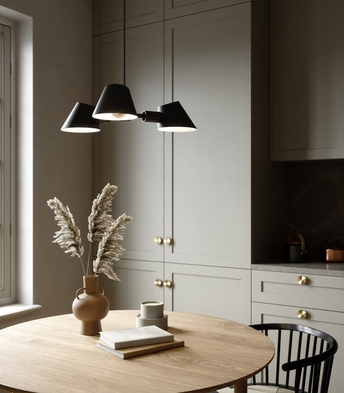 The Rochelle series by Danish designer Charlotte Høncke has a modern Italian design language with three slender, sculptural lamp heads. Cool and almost masculine chrome details add a beautiful contrast to the matte black surface. The pendant is perfect on its own or in a pair above your kitchen island or in a corner.